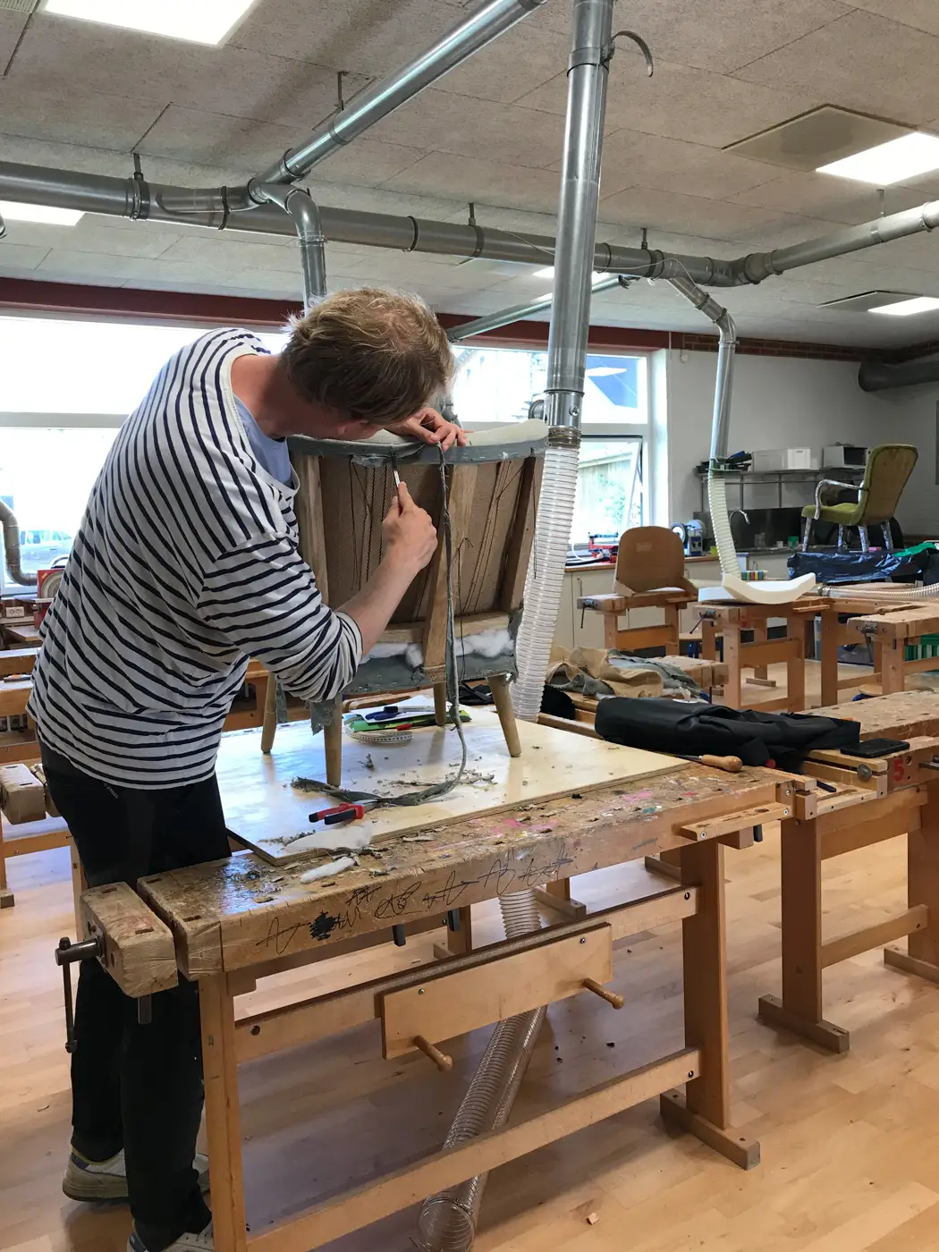 Miljøgevinsten er knap så stor ved at istandsætte moderne polstermøbler, hvor kun stel og fjedrer genbruges. En gyngestol i møbelsnedkerkvalitet, designet af Hans J. Wegner for mere end 50 år siden, fandt Marika var værd at bevare - lige så meget for dens tilknytning til hendes familiehistorie som for miljøgevinsten. Mange melder sig til et kursus, fordi de vil bevare et familieklenodie eller ser mulighed i et loppefund, der kan give deres indretning personlighed.