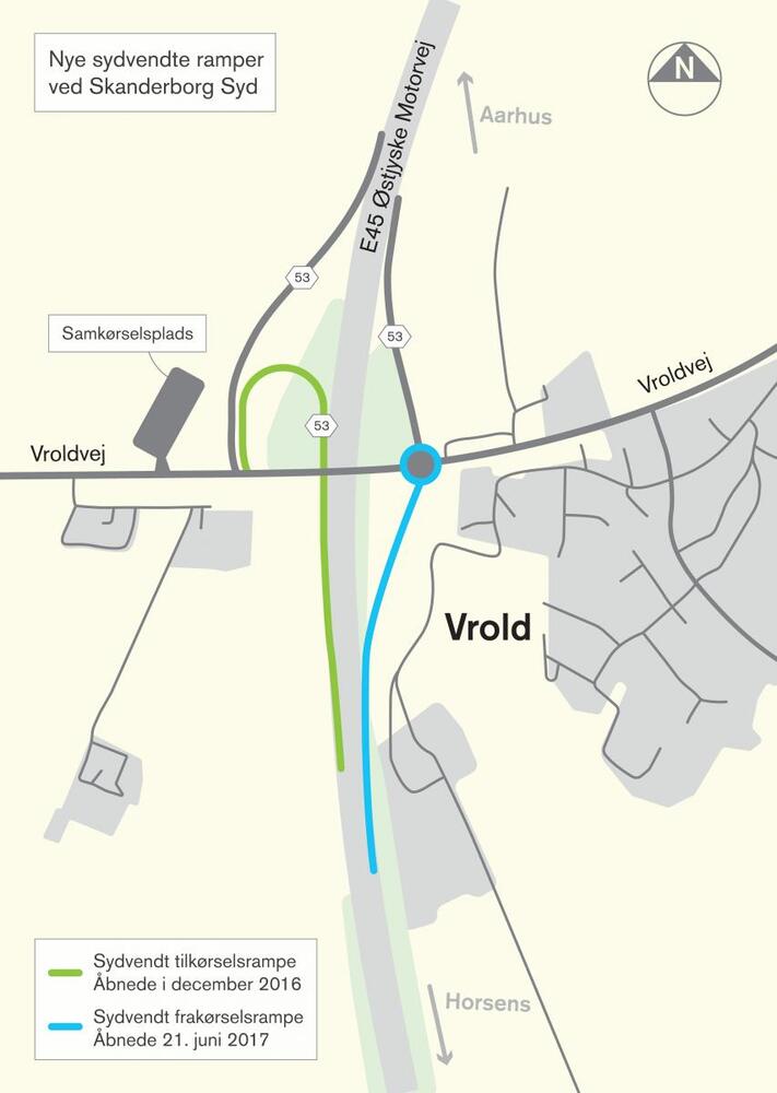 - Skanderborg er en by, der vokser, og det er rigtig godt, at byens borgere og virksomheder nu også får fuld adgang til E45 i den sydlige del af byen. Lige nu er vi ved at lægge sidste hånd på ombygningen af Vroldvej, så den bliver mere sikker for de bløde trafikanter. Det betyder, at vi samlet set får en god og effektiv afvikling af trafikken i Vrold," siger borgmester Jørgen Gaarde, Skanderborg Kommune.