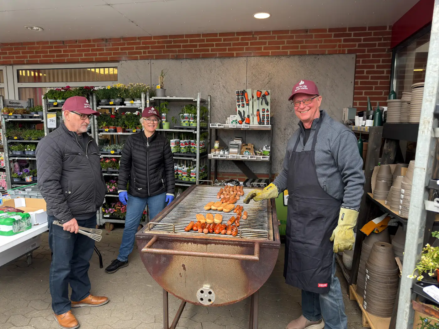 Bestyrelsen ved SuperBrugsen Østbirk havde travlt ved grillen, da blomsterdag igen trak mange besøgende til butikkens populære forårsarrangement. Frankfurterne røg hurtigt over disken.