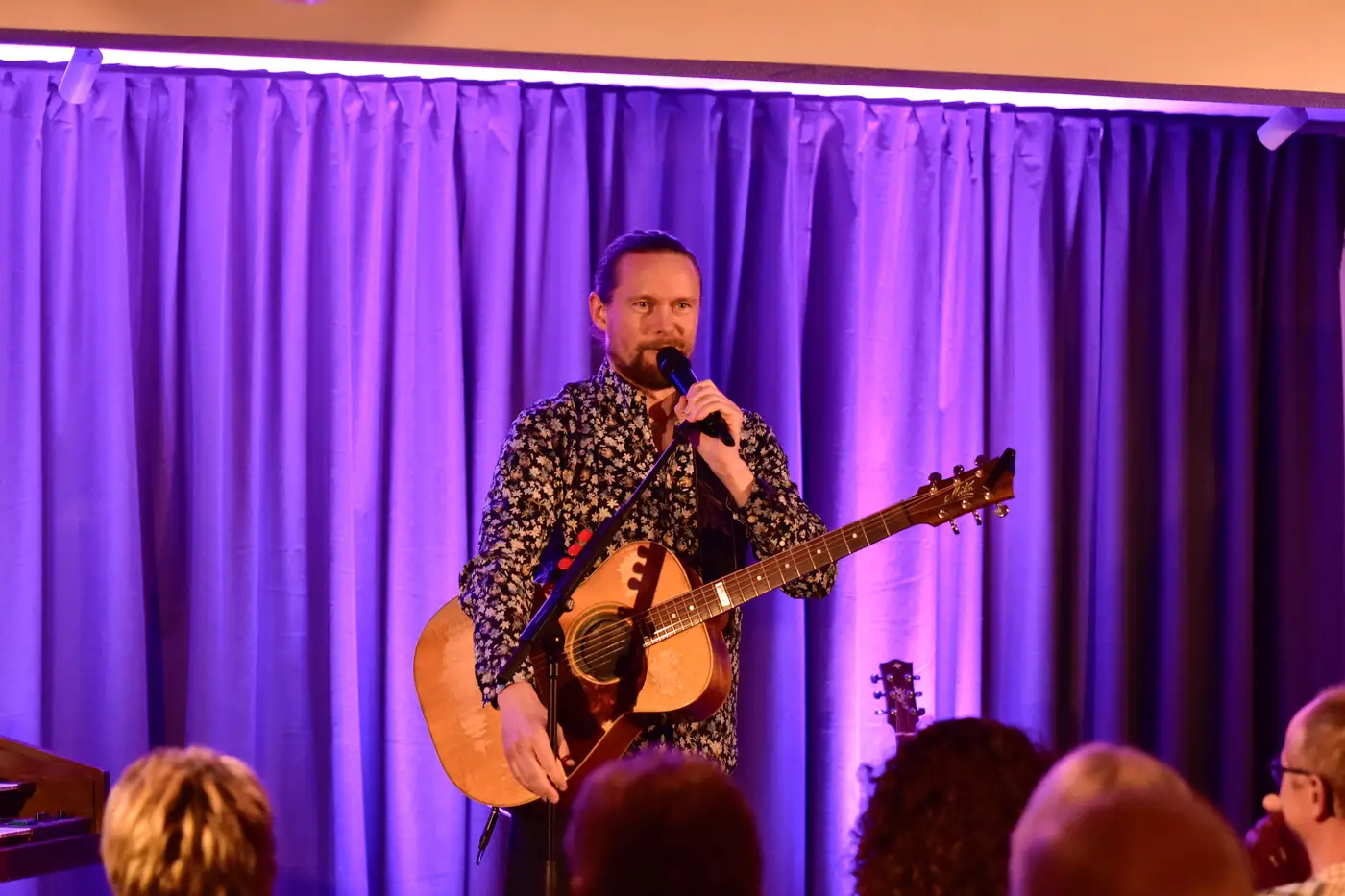 Allerede efter få minutter begyndte grinene at brede sig rundt mellem bordene. Jens Varmløse er nemlig ikke kun en mand med styr på guitaren. Han har også en evne til at levere små historier og bemærkninger, der får folk til at læne sig lidt frem i stolen.