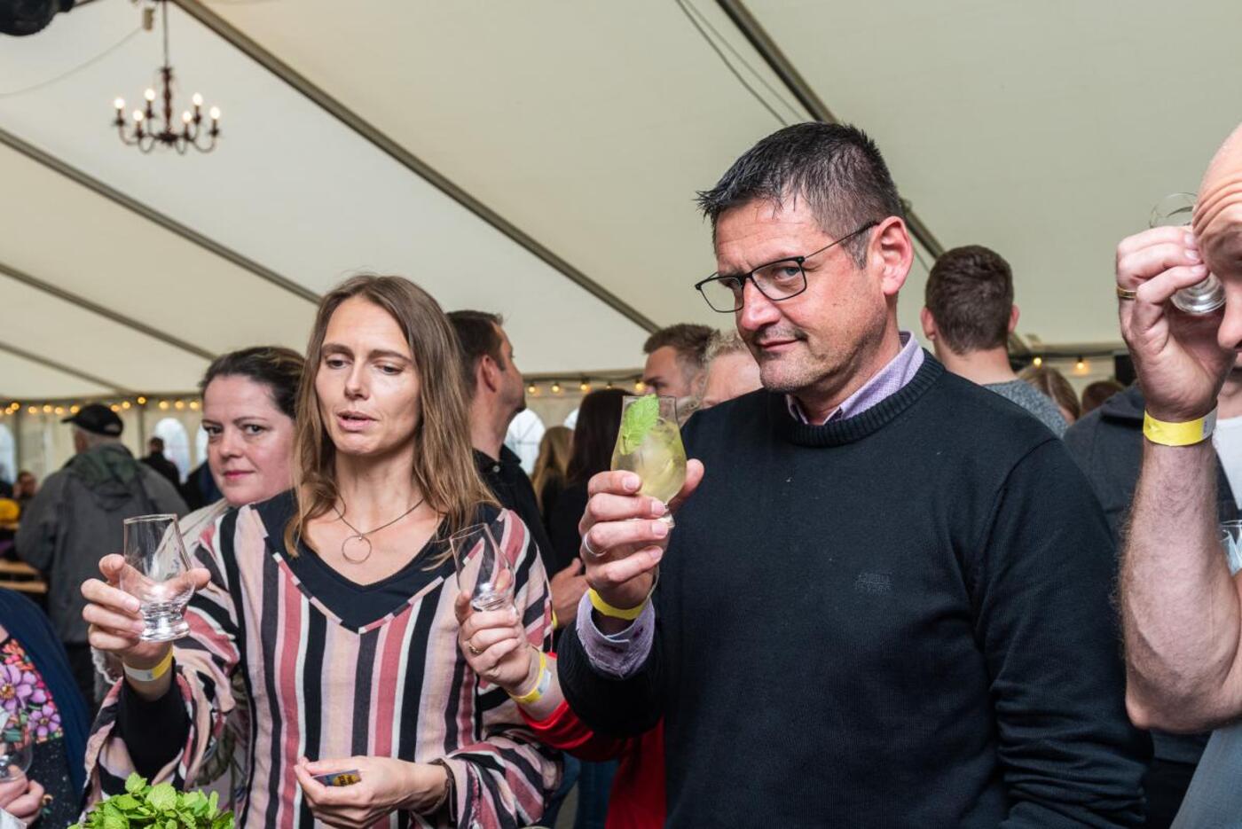 Inde i teltet på pladsen var der fyldt med glade gæster som skulle til gin-smagning. Det hjalp også på temperaturen og luftfugtigheden, at der var tændt for en varmekanon. Imens der blev smagt på gin og alskens drinks spillede Brigsted Bluesband med alle de gode gamle bluesklassikere fra bagkataloget.
