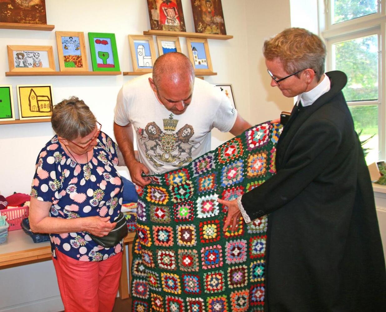 - Det er på tide brun og brændt orange kommer på mode igen, siger Jesper og kigger på udvalget af tæpper på udstillingsbordet i Præstegården. Jesper tager et tæppe om livet: