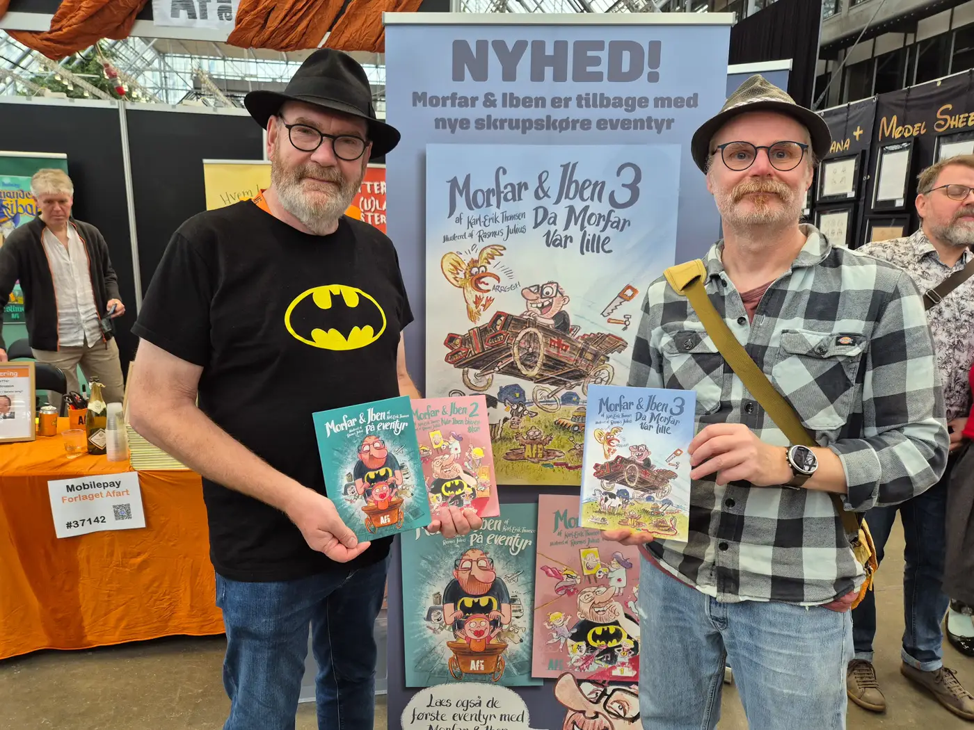 På det ene billede ses forfatter Karl-Erik Thomsen til Bogforum 2025 med sine 3 bøger i Morfar & Iben serien. Og på det andet ses både forfatter (th) og Illustrator Rasmus Julius (tv).