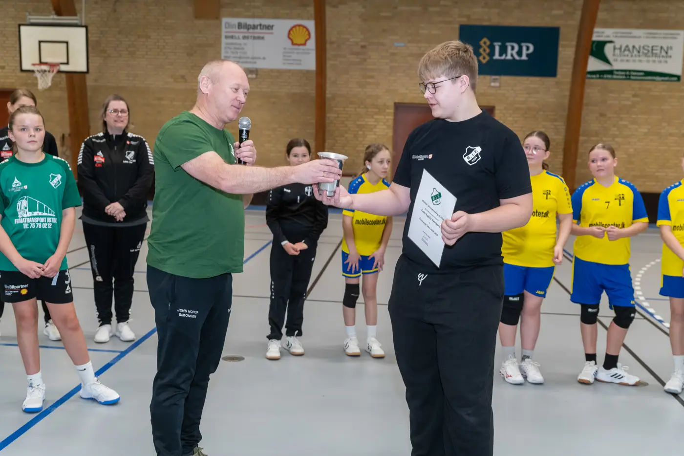 Bestyrelsesformand Jens Norup Simonsen overrakte pokal og diplom til en glad og overrasket Felix i forbindelse med håndboldbrag i Østbirk hallen den 1. marts.