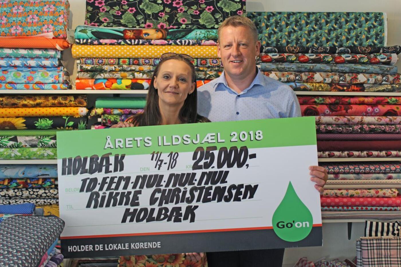 Mick Kjær fra Go’on overrækker titlen og 25.000 kr. til Rikke Christensen fra Holbæk.
