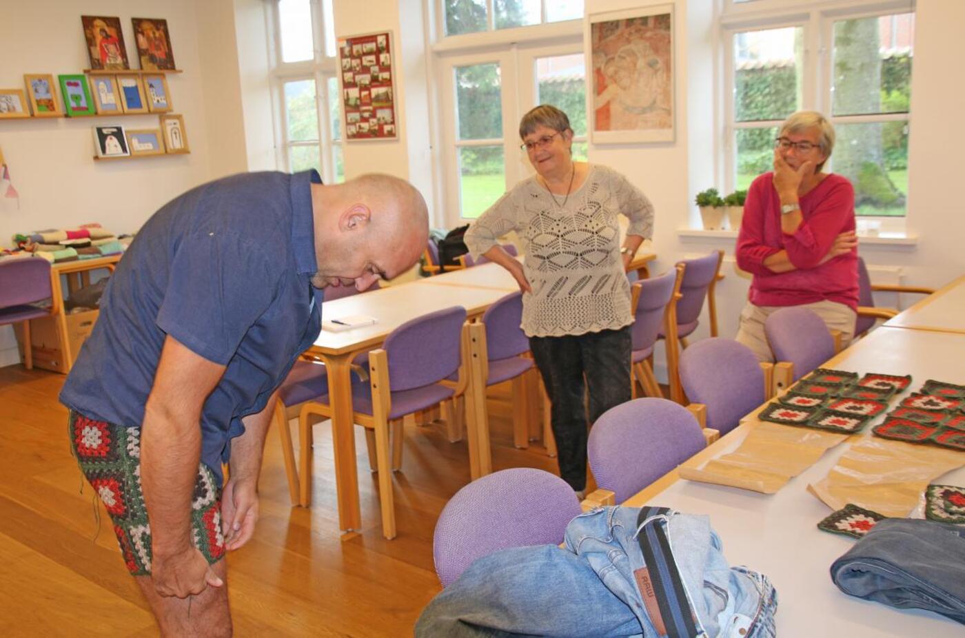 Jesper Ahnfeldt-Mollerup betaler 500 kr. for de hæklede bukser. Pengene som strikkedamerne i Østbirk Præstegård indtjener sendes videre til Varmestuen i Horsens og klubbens sponsorbarn i Indien.