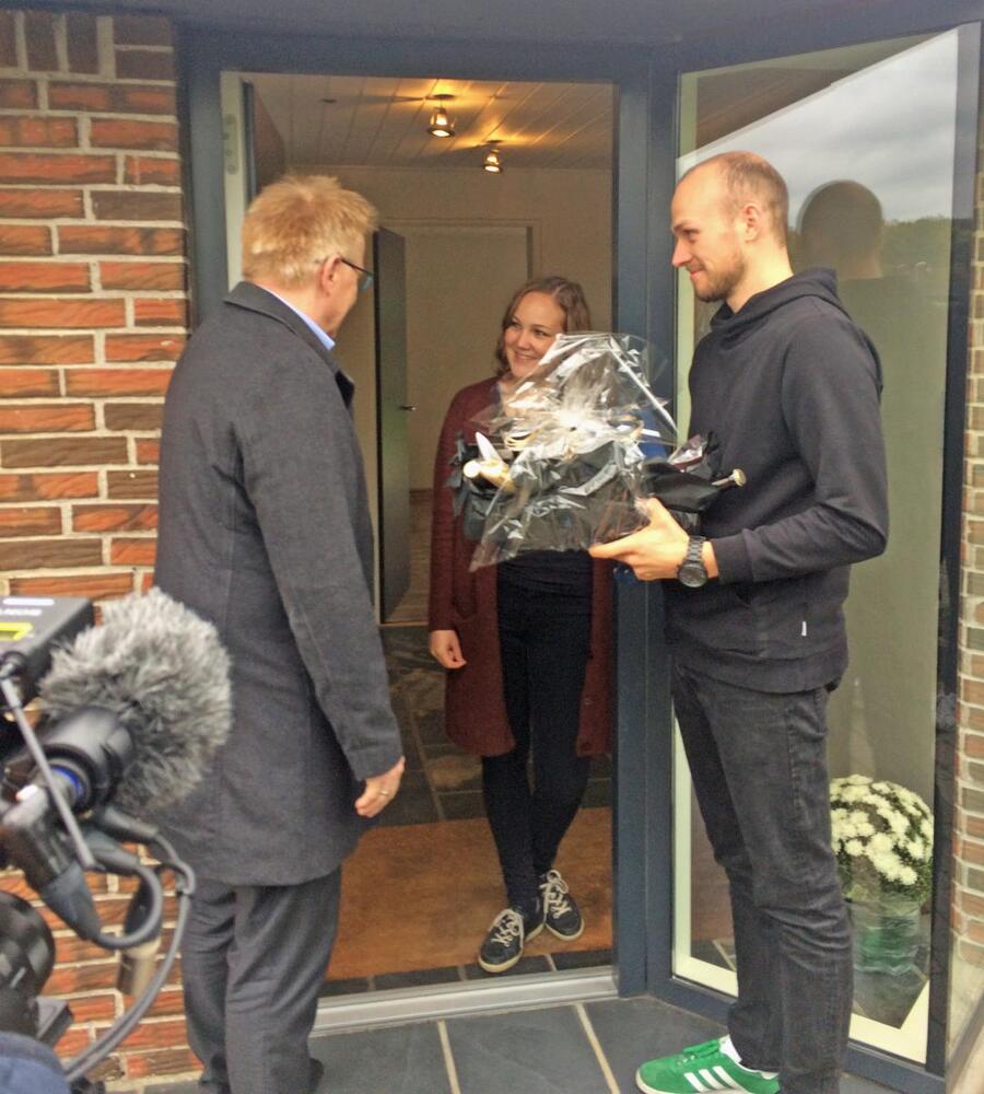 Borgmester Peter Sørensen var mandag eftermiddag på besøg hos det unge par for at byde velkommen og lykønske med blandt andet en kurv med lidt godt til ganen.