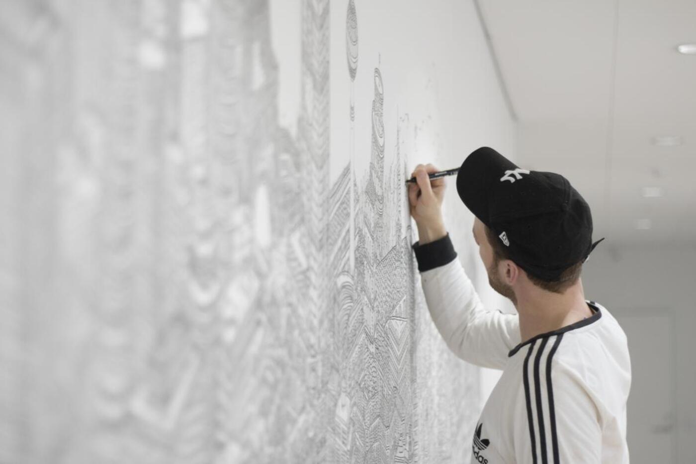 Med tuschen direkte på KUBENs 6 x 6 m store glasfacader vil Daniel komponere en skyline af bygninger, der vil forsøge at repræsentere Horsens, inklusiv overraskende elementer på baggrund af en blandet flok nationaliteter blandt horsensianerne.