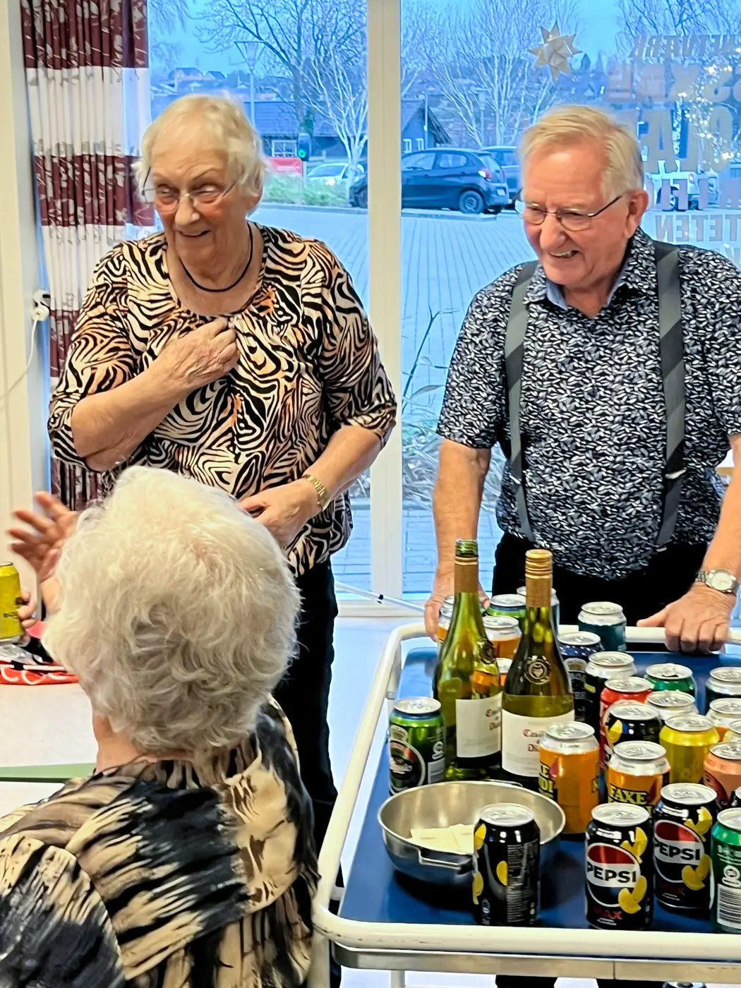 Bodil, Kurt, Karen, Kate, Betty og Karen sørgede under hele julefrokosten for, at der var mad i rigelige mængder på bordene, og Jens gik stadig rundt og sørgede, som en anden tjener Bolt, for, at ingen sad og tørstede – mon Jens egentlig nåede selv at få noget at spise og drikke.