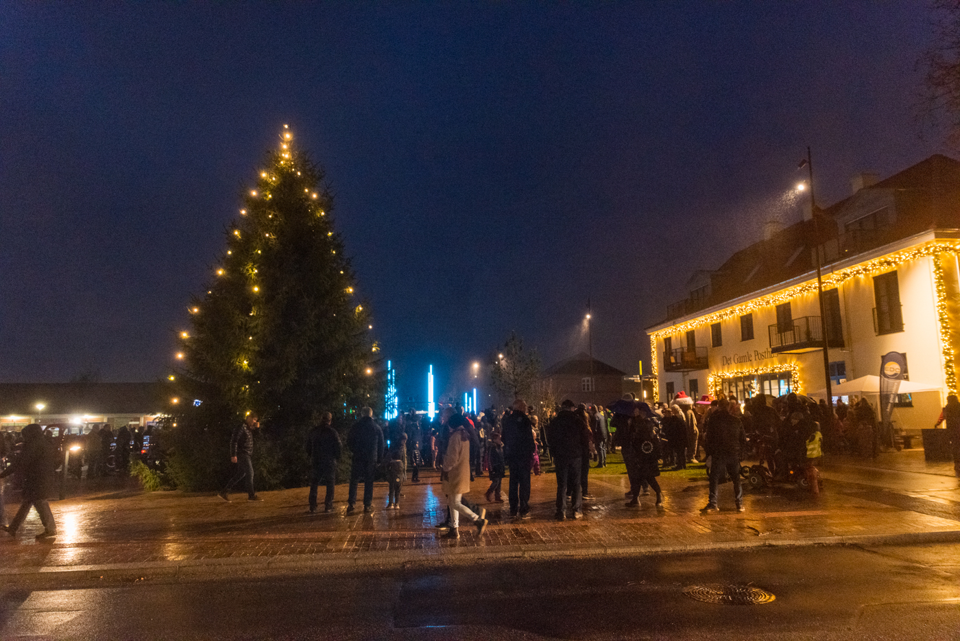 Der var mange mennesker på torvet og hyggeligt så det ud med lysene på husene, og det var nemt at komme i julestemning selvom finregnen fik de fleste til at trække hatten godt ned om ørerne.