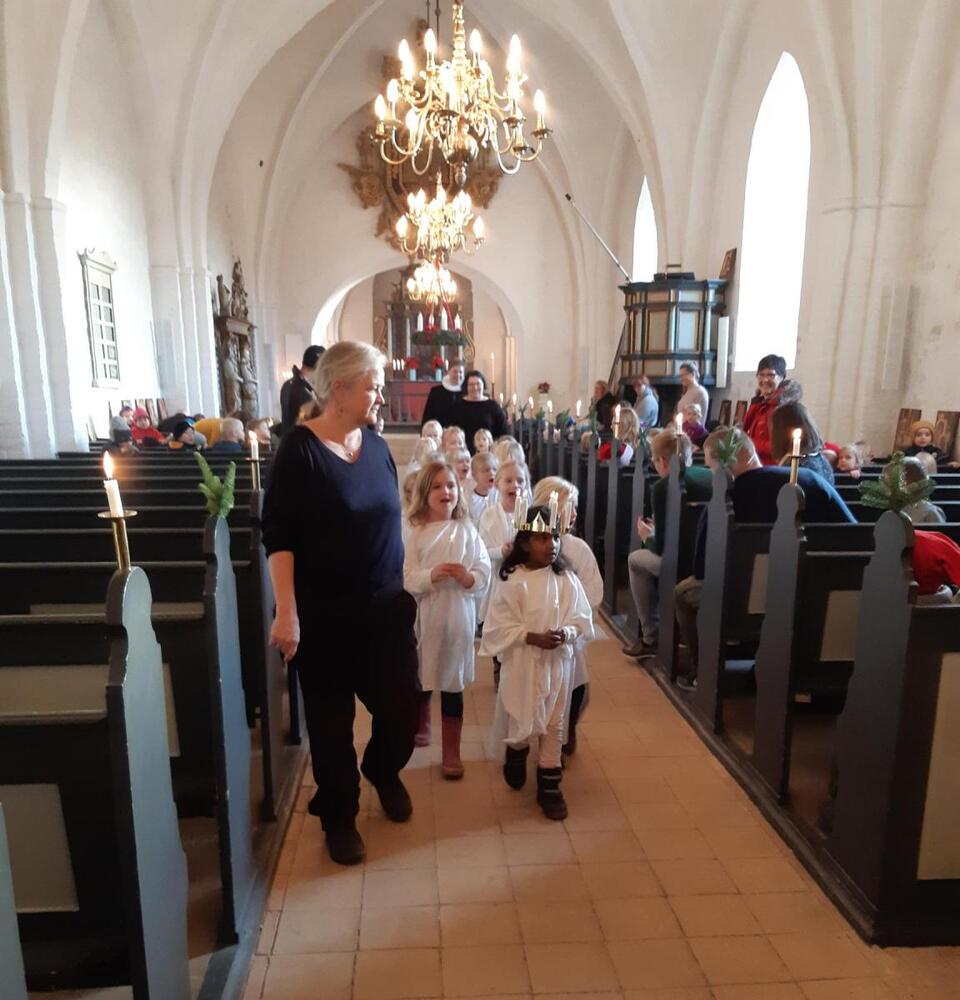 Dernæst kom 150 oplagte børnehavebørn, pædagoger og enkelte forældre for at opleve julestemningen sprede sig med lysene fra det fineste Luciaoptog. De yndige Luciapiger kunne selv synge og skulle kun hjælpes en lille smule på vej af de årvågne og dygtige pædagoger! Et barn er født i Betlehem blev det også sunget inden præsten kunne fortælle om den vordende moder Maria; den fortvivlede Josef, der ikke kunne finde et sted at sove til sin familie; de tre fattige hyrder og de vise mænd, der alle så Guds store julegave til menneskene komme til jorden: det lille Jesusbarn.