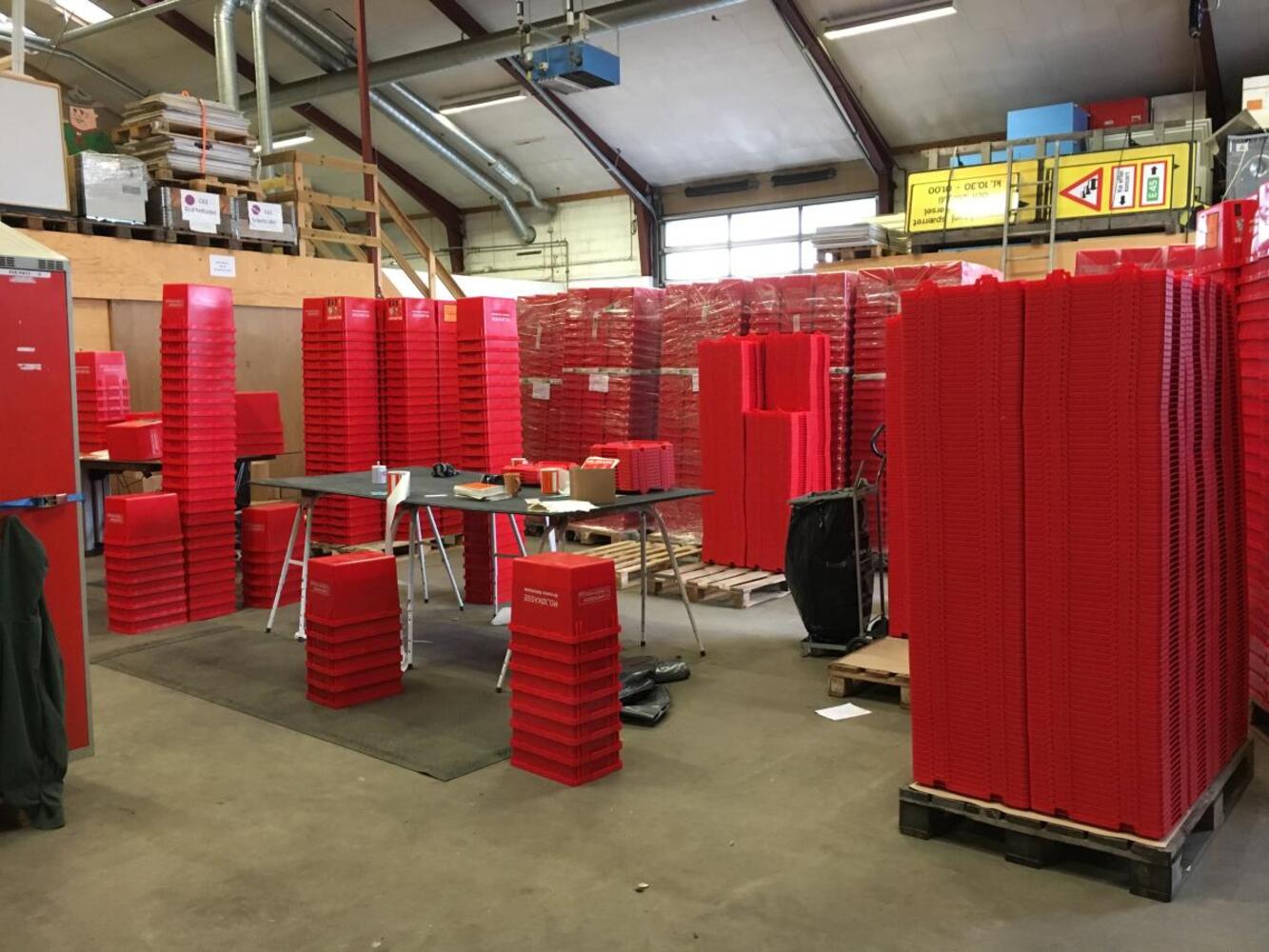 En hel masse røde kasser til miljøfarligt affald og småt elektronik bliver i den kommende tid kørt ud til 24.000 husstande i Horsens Kommune. Foto: Horsens Kommune