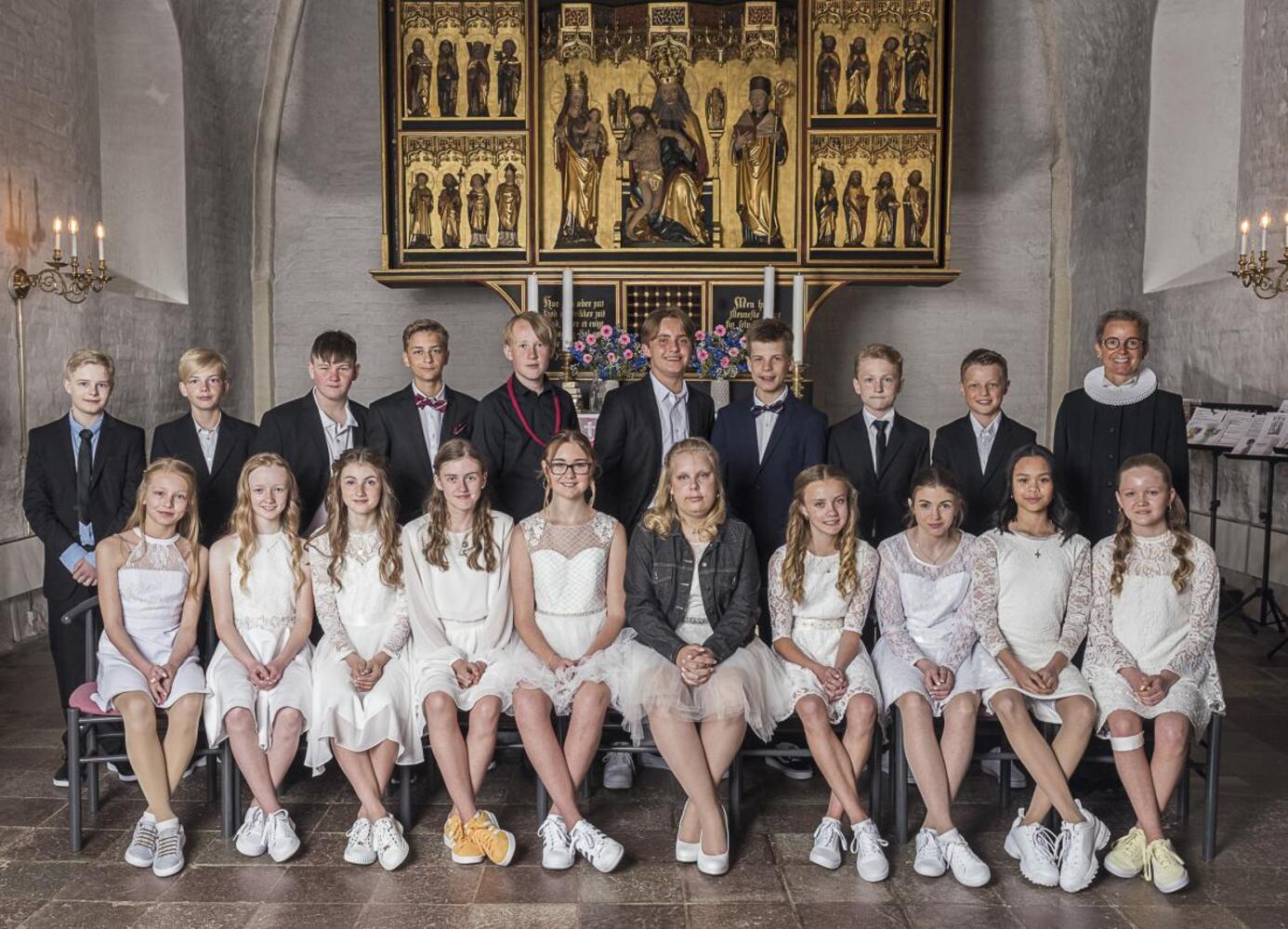 Benjamin Bovenkamp, Christian Wistoft-Ibsen, Mikkel Grønskov, Mads Kirkegaard Møller Nielsen, Birk Høj Madsen, Philip Rosendal Jakobsen, Mads Ellegaard Nauta, Oskar Sondaj Sørensen, Asmund Tind Hauch og sognepræst Lone Buhl Pedersen.