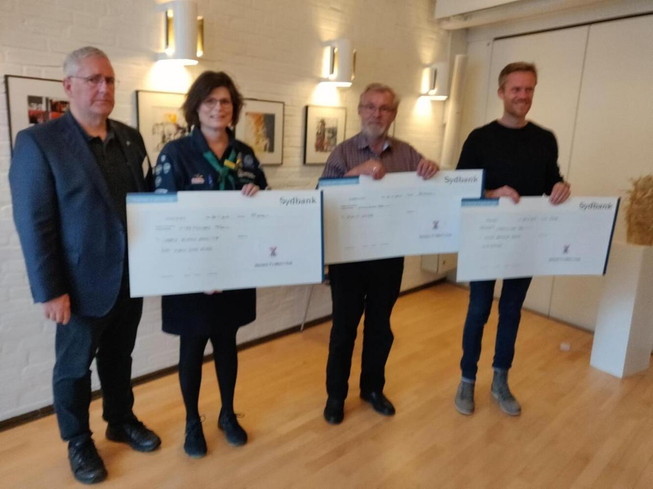 Fra venstre Præsident Flemming Skipper fra Horsens Y’s Men’s Club uddelte priserne, Carrie Acton Harritsø fra DDS Karen Jeppe Gruppe, Benny Petersen fra Klub for handicapidræt og Stefan Børgesen Keller fra MTB Gedved. (Privatfoto)