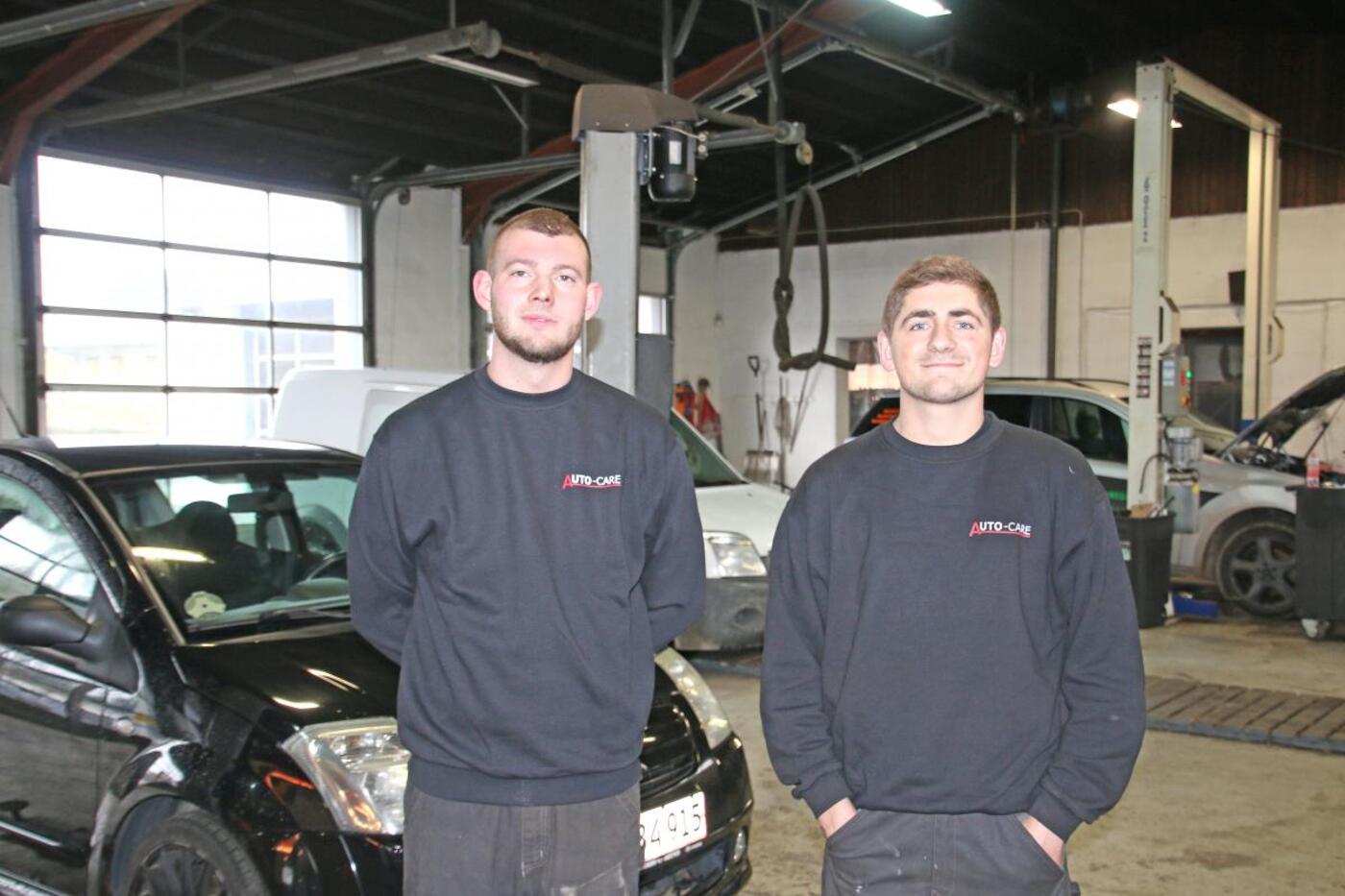 I værkstedet sammen med Mathias går mekanikersvend Mads Kiel, og de 2 er klar på et foto for at gøre kunderne opmærksomme på at der er endnu en mulighed for reparation af bilen i Østbirk.