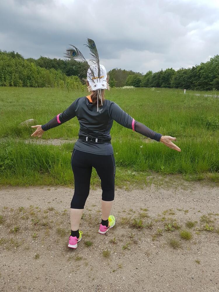 - Jeg har lavet en kasket med øjne, som jeg sætter omvendt på hovedet, så jeg løber med øjne i nakken. Jeg har sat fjer i, så jeg bliver større. Folk tror, jeg skal til karneval i skoven, men jeg håber, det kan skræmme musvågen væk, så jeg kan fortsætte mine løbeture i skoven. Dem vil jeg aldrig undvære, siger Lisbeth Preil.