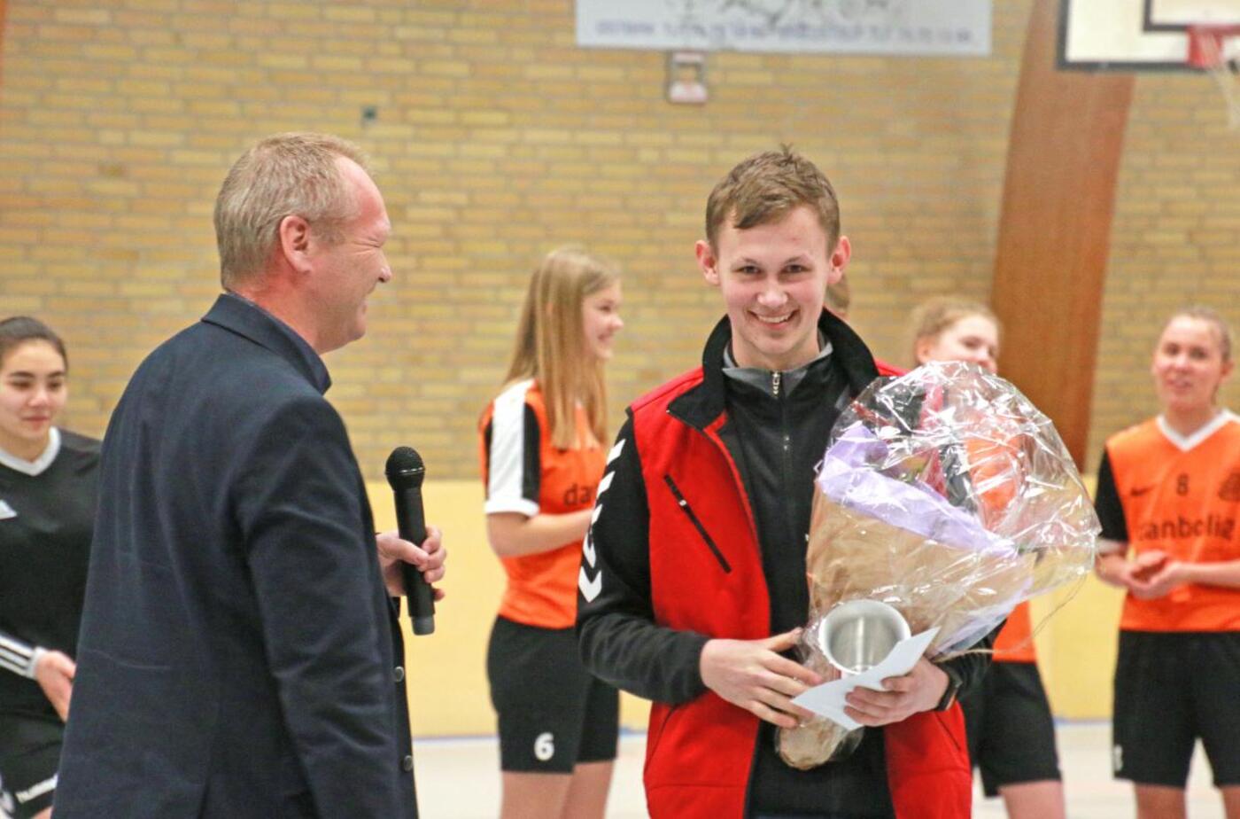 - Vi har igennem et stykke tid vidst, hvem der skulle være årets unge leder 2017, men havde også besluttet at overrækkelsen skulle ske i årets unge leders nærmiljø, sagde formand for Østbirk IF, Jens Norup Simonsen, forud for overrækkelsen og lige efter indløb fredag aften af de første hold i Østbirkhallen til 2018-udgaven af indefodboldstævnet ”kun for piger”, Trailergaarden Gantrup Cup.