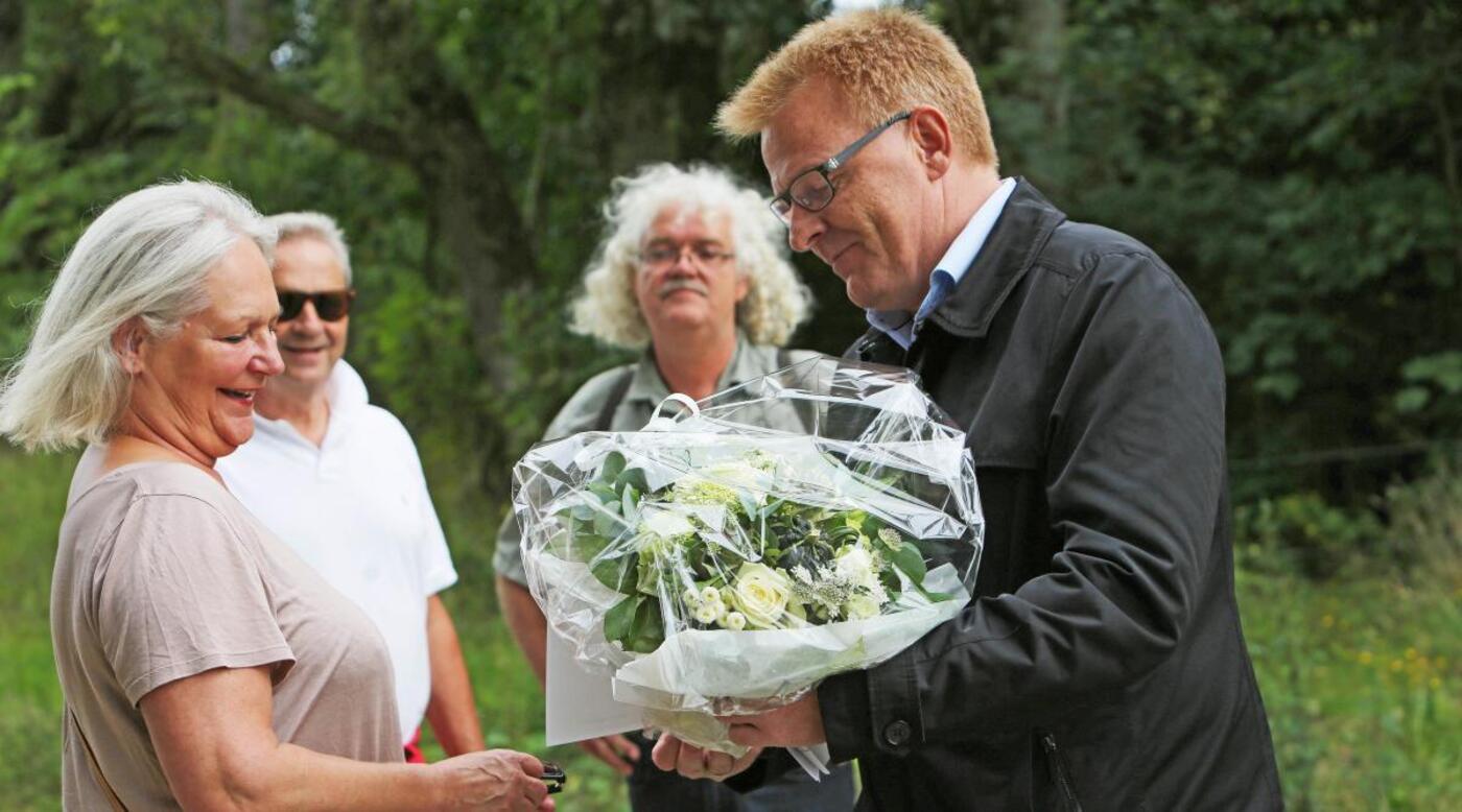 Det kom som noget af en overraskelse for Jette Nielsen fra Horsens, da hun torsdag blev gæst nr. 100.000, som besøgte Den Genfundne Bro ved Vestbirk og i den forbindelse modtog en buket blomster af borgmester Peter Sørensen.
