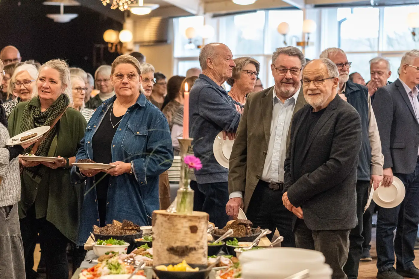 Mens buffeten lokkede med farver og dufte, gled folk rundt i en let kø, hvor man både småsnakkede og ventede tålmodigt. Musikken stod klar i baggrunden som dagens store løfte, og den hyggelige uro i salen havde sin helt egen rytme. Som om alle var indstillet på at tage dagen i samme tempo.