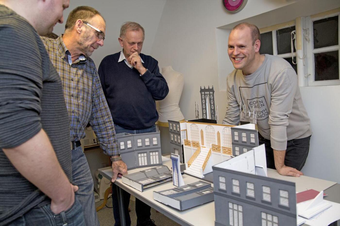 Scenograf Anders D. Jensen (th) fik stor ros, da han præsenterede modellen til scenen. Det ser spændende ud, men der bliver nok at se til, erkendte fra venstre scenemester Jesper Hansen og scenebyggerne Finn Mortensen og Andreas Aaberg. Foto Rikke Kidmose