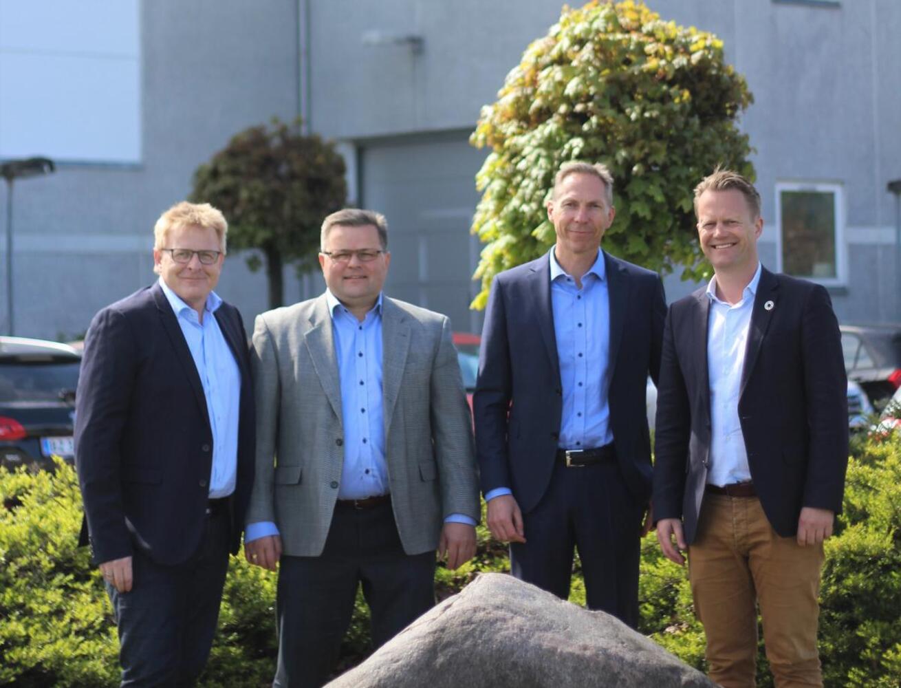 Jeppe Kofod og Horsens-borgmester Peter Sørensen (S) mødtes med Søren Munch, direktør i Hamlet Protein, og Stig V. Petersen, VP Operations i Hamlet Protein. På billedet står de fire foran fabrikken. Foto: Nina Bengtsson.