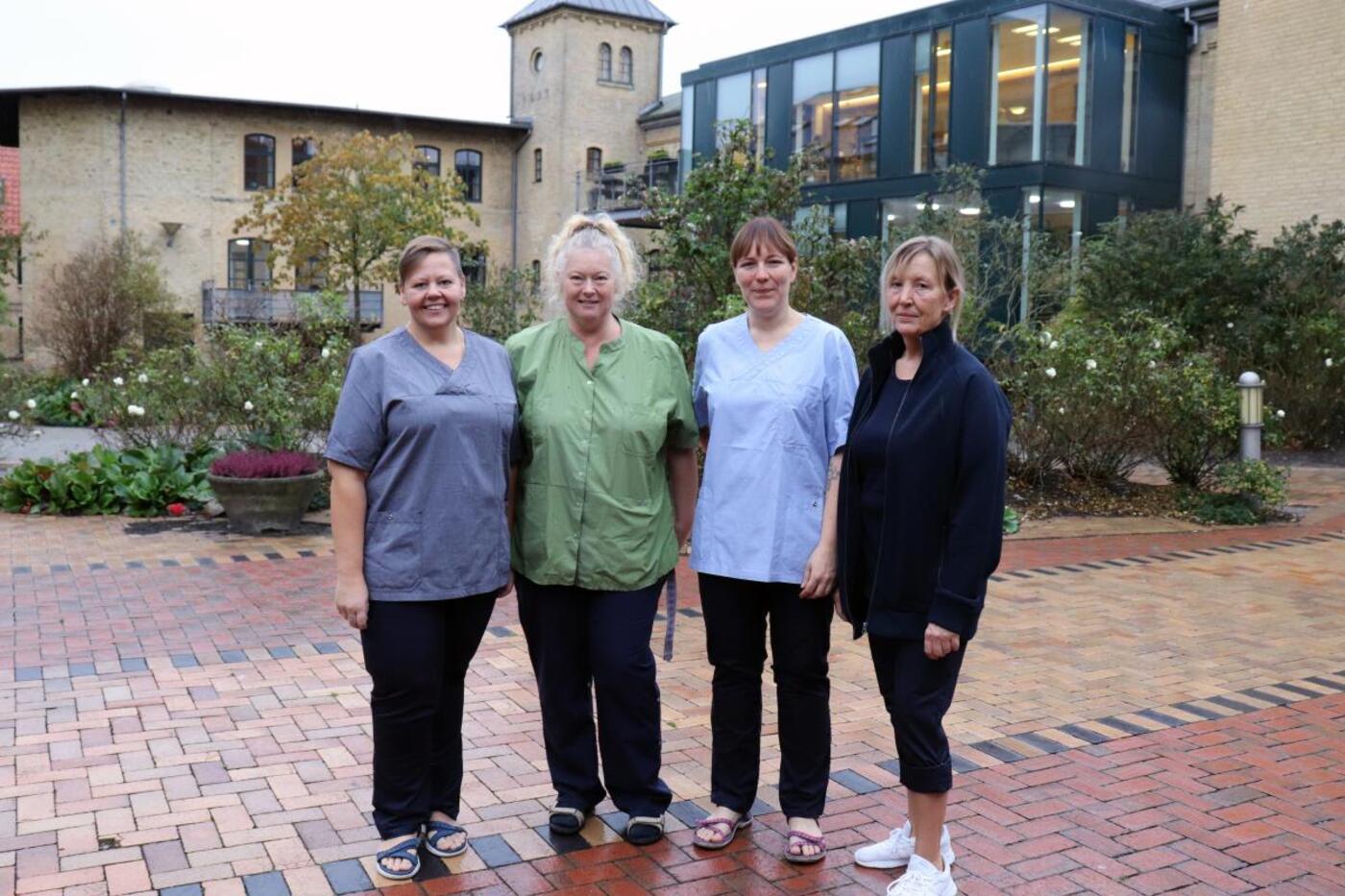 Det er lækkert at have på, og der er plads i lommerne til både mobiltelefon og håndsprit, siger Mette Jacobsen, Jane Wismar, Charlotte Fryland og Helle Eisner, da de for første gang hopper i det nye outfit. (Foto: Horsens Kommune)