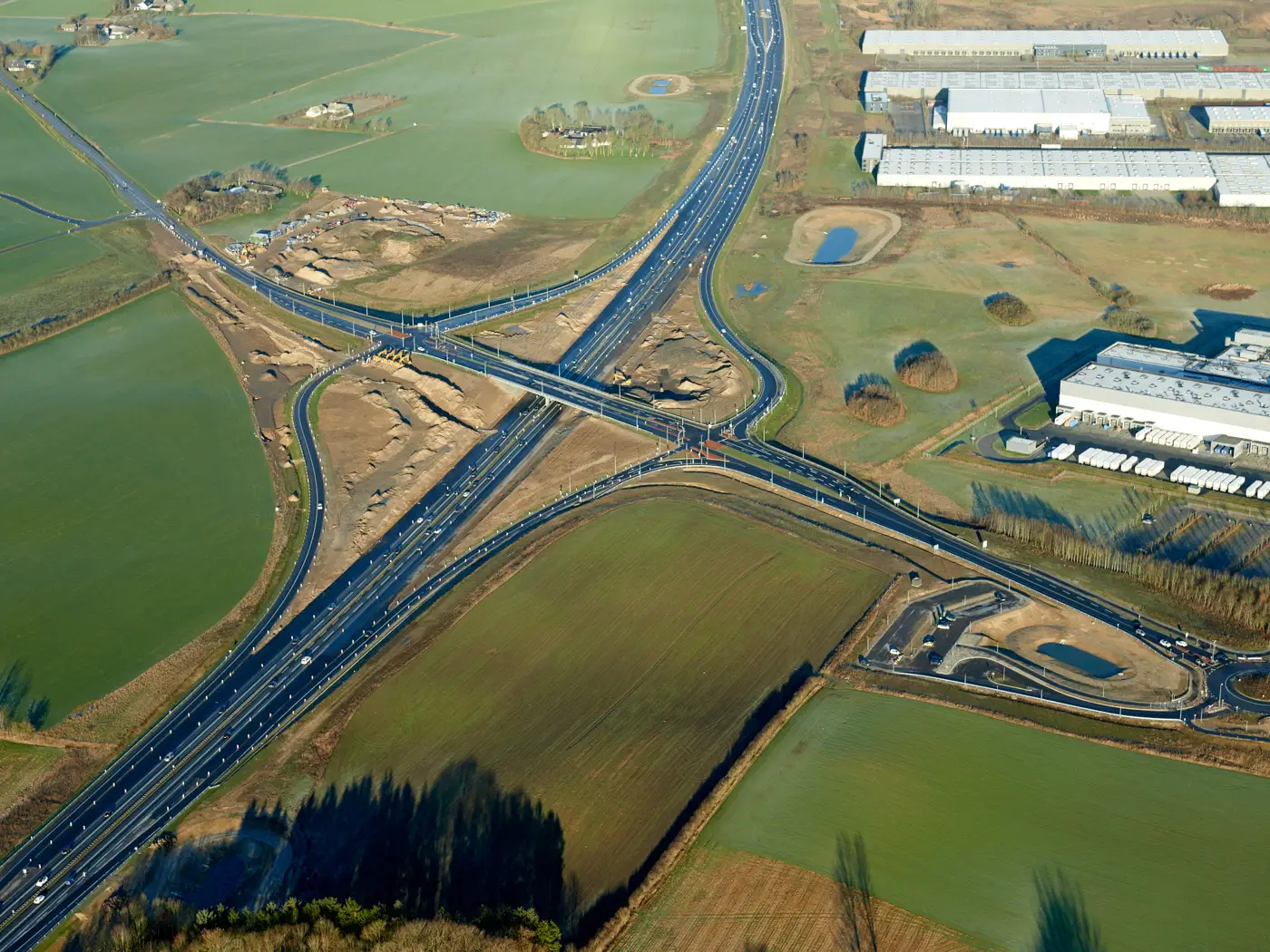 Slidlagsarbejdet på Østjyske Motorvej E45 nord for 55 Horsens N begynder midt april. Foto: Aerodan/Vejdirektoratet