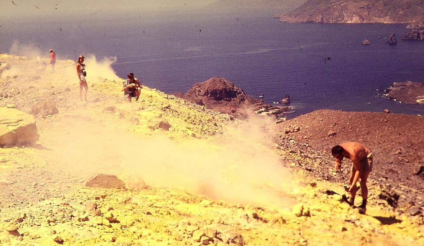 Jeg har besøgt vulkaner mange steder, f.eks. Etna på Sicilien. Den er godt 3 km høj og dækker et område på størrelse med Lolland. Vulkanen er altid i udbrud. Sommetider er det voldsomt, som da byen Catania ved foden af Etna blev helt ødelagt for 400 år siden. Man kan altid se røg fra vulkanen, og ofte løber der glødende lava ud. Den er 1100 grader varm og gløder. Jeg har gået på en levende lavastrøm, det kan lade sig gøre, fordi overfladen størkner til luftfyldte slagger. Hvor lavaen strømmer nedad en skråning, kan man se dens glødende indre. Der var en fører med, der sørgede for at vi undgik farer. Der var ikke langt til Krateret, hvorfra der lød et hult drøn hvert andet minut. Så hostede vulkanen store glødende lavaklumper et par hundrede meter op, hvorfra de faldt ned på kraterets yderside. Samtidigt kom der aske op, det er pulveriseret lava. Det satte sig i næsen, og flere timer senere kom der aske ud, når man pudsede næse. Lugten af svovlbrinte, salmiak og andre ubehagelige stoffer generede. Men det var betagende at besøge en vulkan i udbrud.