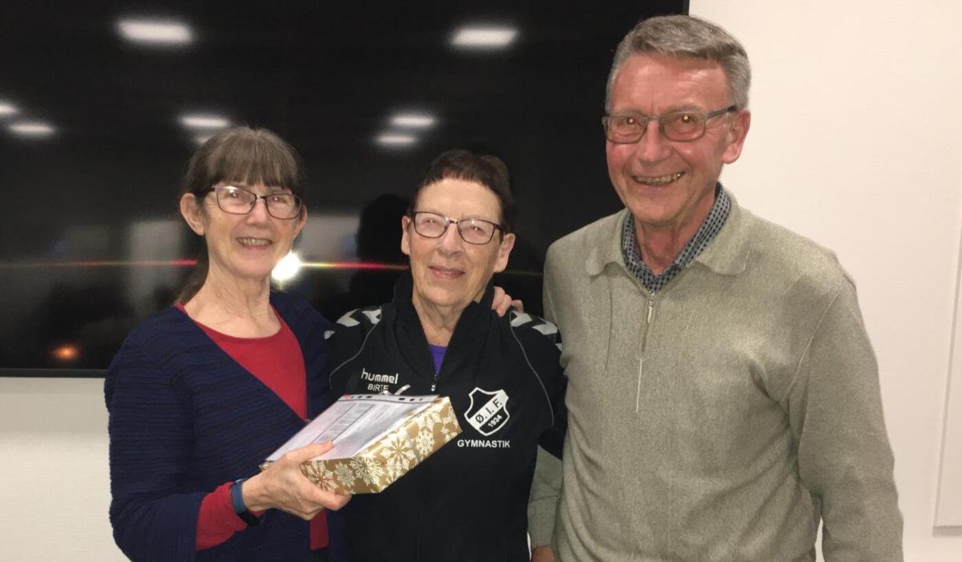 Ved afslutningen på idrætsmærkesæsonen 2019 modtog Ann Asmussen (t.v.) og Leif Kristiansen en ekstra gave af Birte Jensen, fordi de har været med i 25 sæsoner.