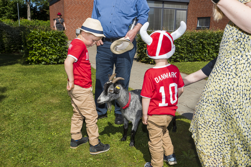 Det var et herligt syn som mødte alle der kom ind på græsplænen ved Gedvedhus. Her står en hest med flot fjerprydelse og åd græs. En lille søg ged vekslede mellem at trimme hækken og tigge popcorn hos de børn som var mødt op med deres forældre.