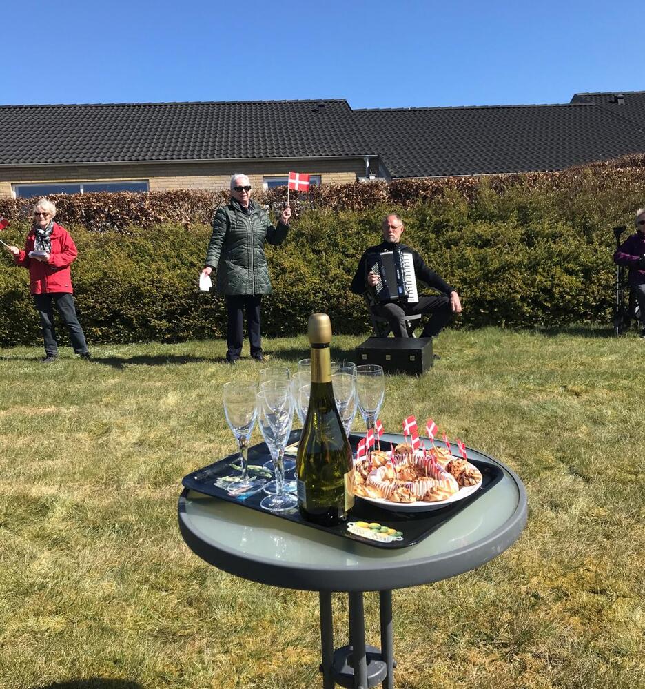 På Nybakken har de jo deres helt egen spillemand Laurits Jørgensen så her blev fødselsdagssangen ledsaget af harmonikaens toner. Grundejerforeningen havde også sørget for flag, bobler og kransekage.