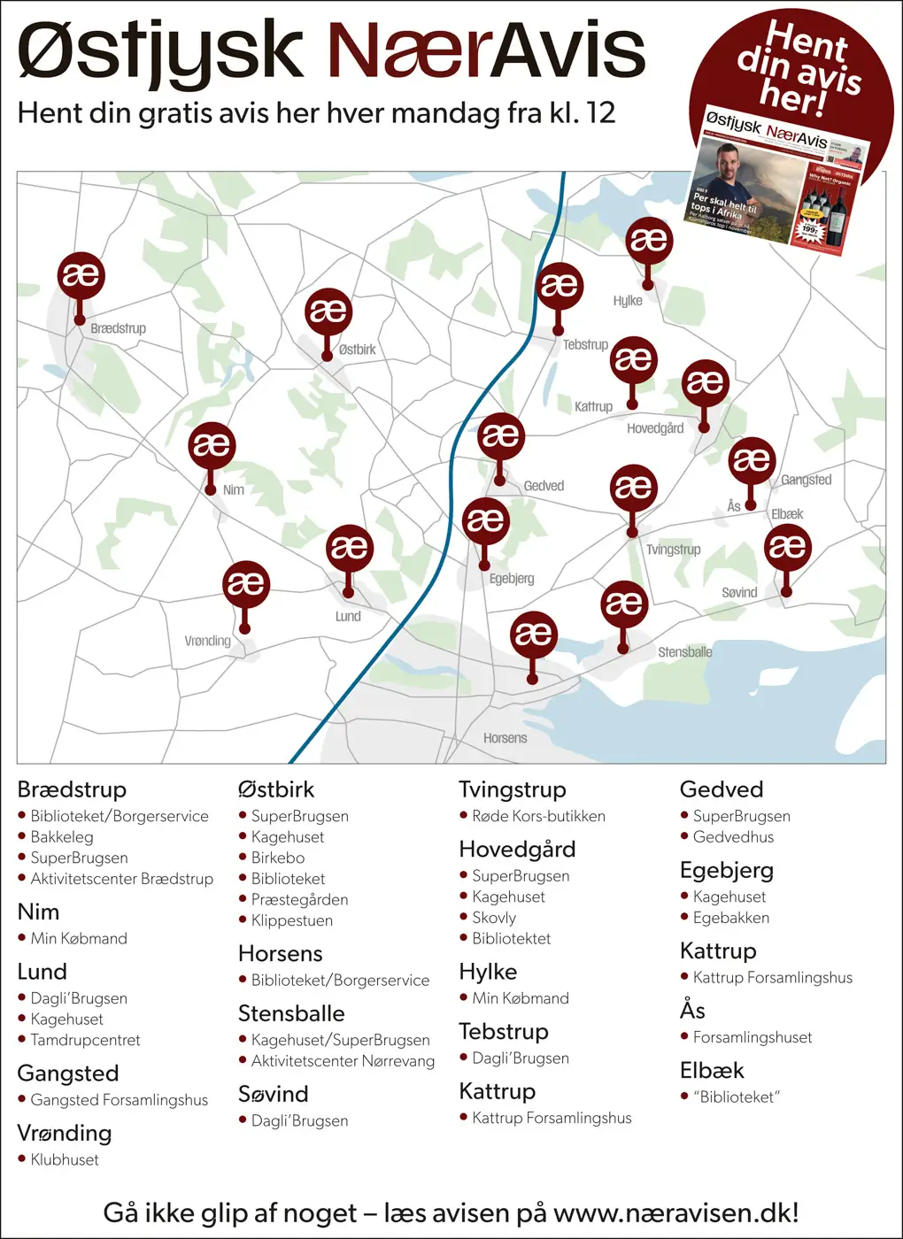 Fra den 26. maj 2025 stopper vi med at omdele avisen til alle husstande. I stedet kan læserne hente den gratis på mere end 30 forskellige steder – f.eks. når de alligevel handler. Vi sætter standere op i bl.a. Østbirk, Brædstrup, Gedved, Hovedgård, Horsens og flere andre byer.