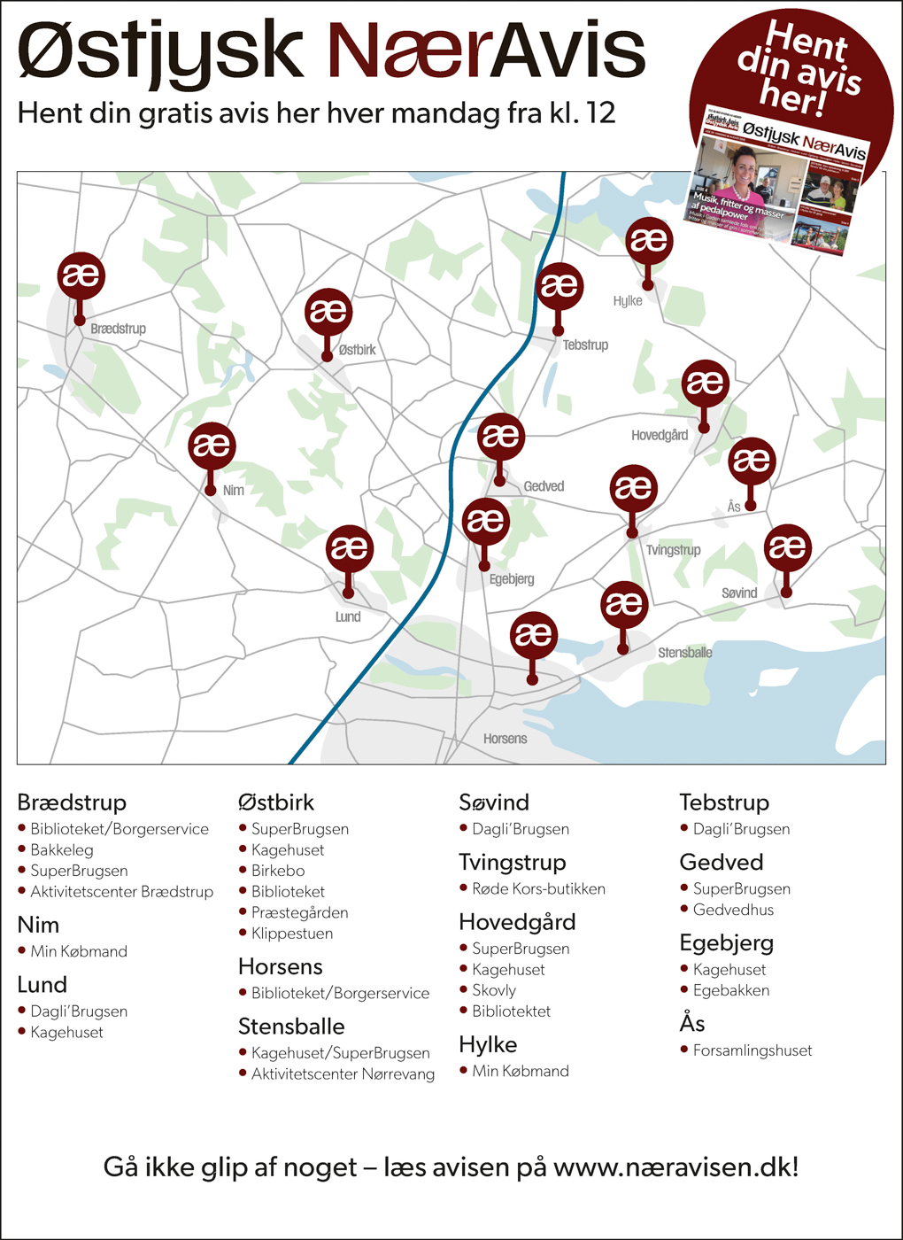 Her finder du en oversigt over de steder, hvor Østjysk Næravis kan afhentes hver uge.