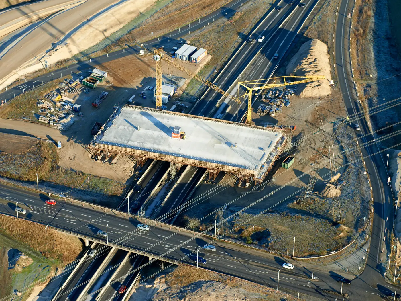 E45 spærres forbi <56a> i aften- og nattetimerne fra den 16.-19. marts mens den kommende bro løftes på plads. Foto: Aerodan/Vejdirektoratet