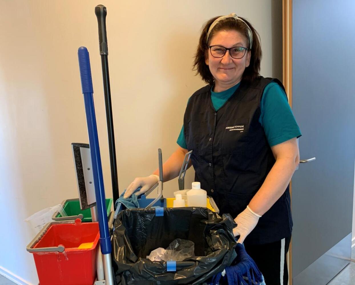 Amira er en af de ansatte, der gør dagtilbud og skoler rene. Her er hun i gang i institutionen H-huset på Ternevej. Foto: Horsens Kommune