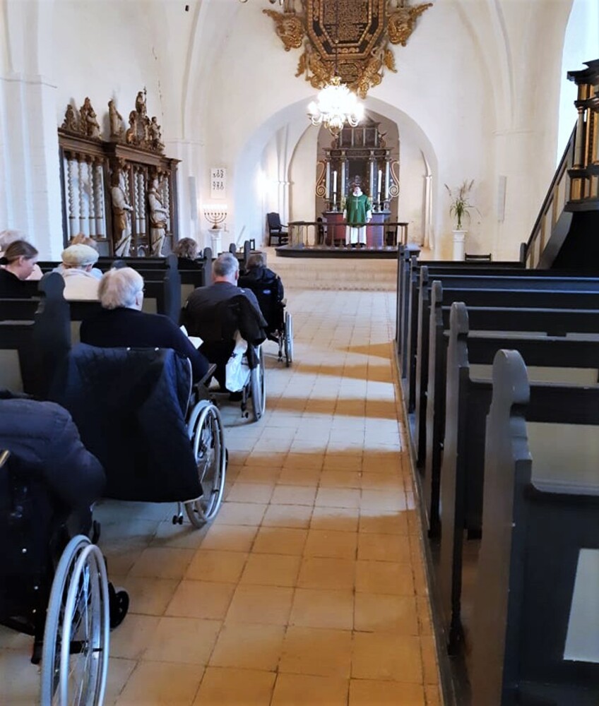 Og det er ganske rigtig svært at overskue kørsel frem og tilbage fra kirken søndag formiddag, hvis man har behov for en bil, der kan rumme en person, der ikke kan komme ud af kørestolen. Det kan dog stadig være et brændende ønske at opleve gudstjenesten i det fantastiske og dertil indrettede kirkerum, og derfor havde Egebakkens aktivitetsansvarlige fået turen arrangeret sammen med kirken.