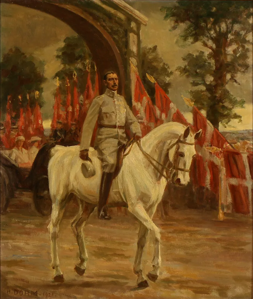 Genforeningen den 10. juli 1920. Kong Christian X rider igennem æresporten ved Frederikhøj.