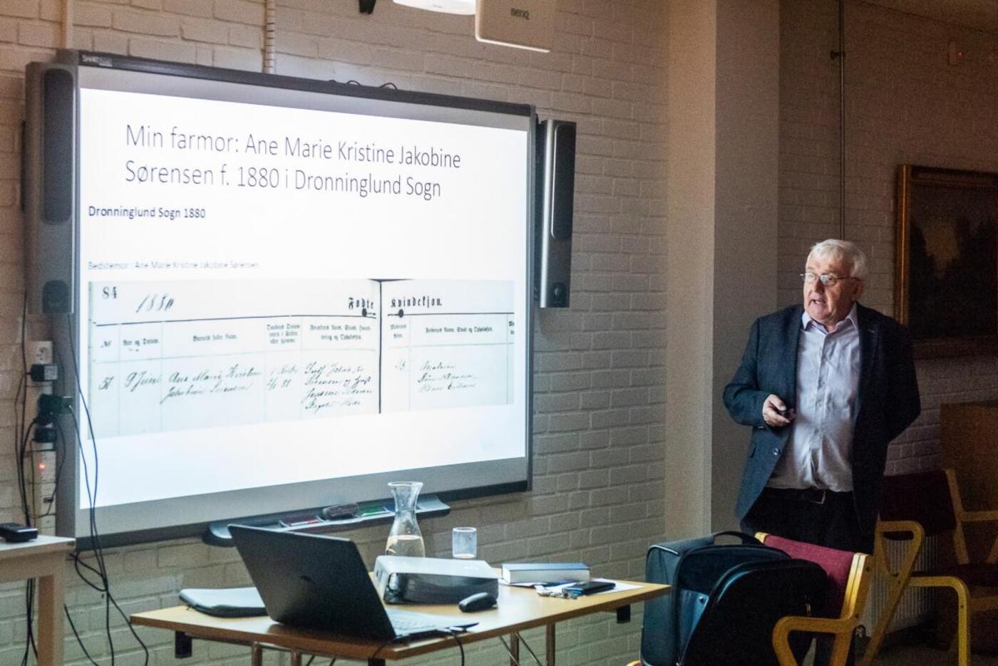 Der var mødt om 35 personer op på Birkebo som alle sad og lyttede interesseret med i halvmørket, mens Henning Frandsens lysbillede-show fløj forbi oppe på lærredet.