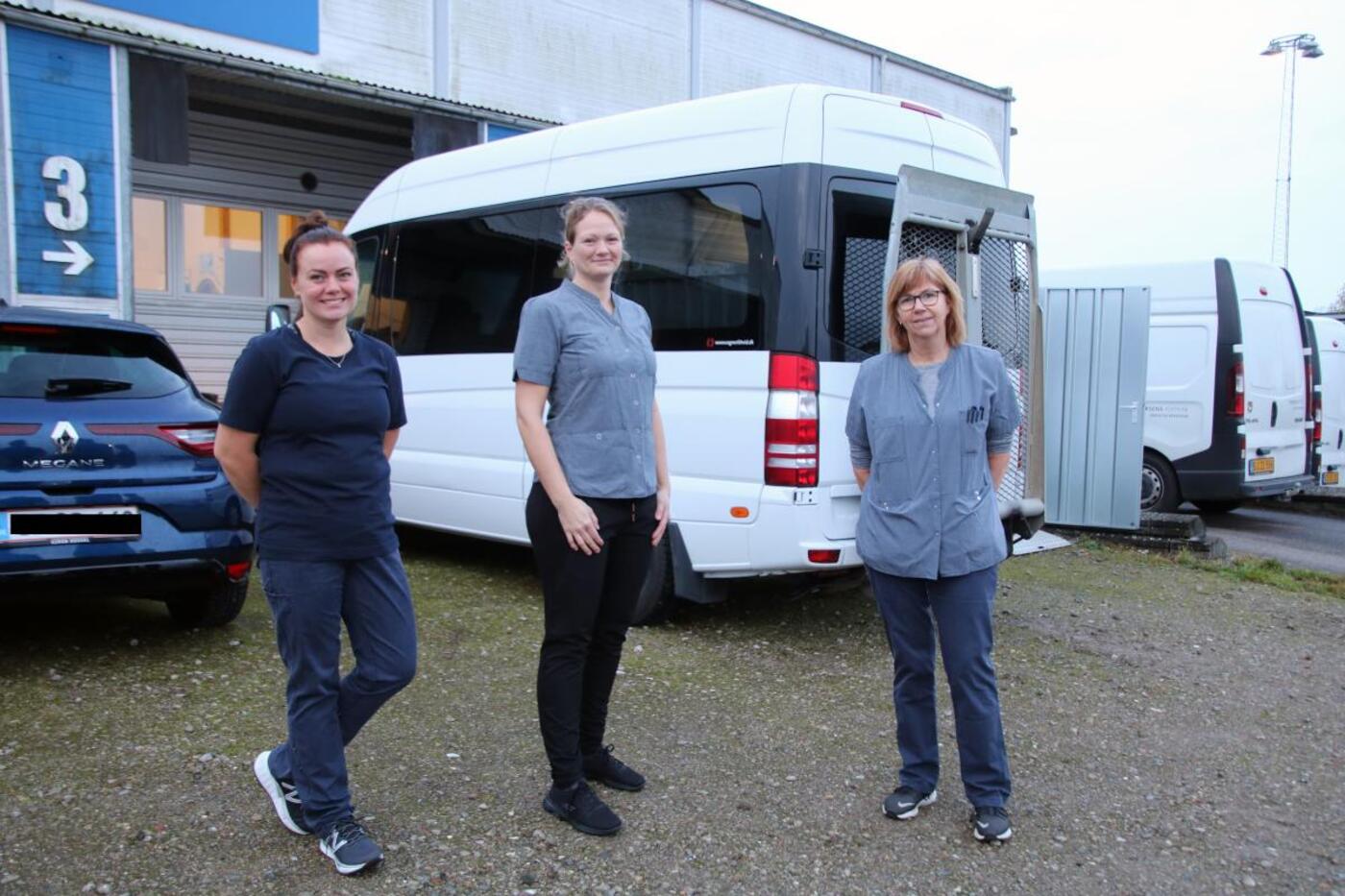 Her er det sygeplejerskerne Camilla Hedevang Pedersen og Dina Jakobsen, samt Social- og sundhedsassistent Gudbjørg Stensdottir, som er på vej ud på den første rute med testbussen.