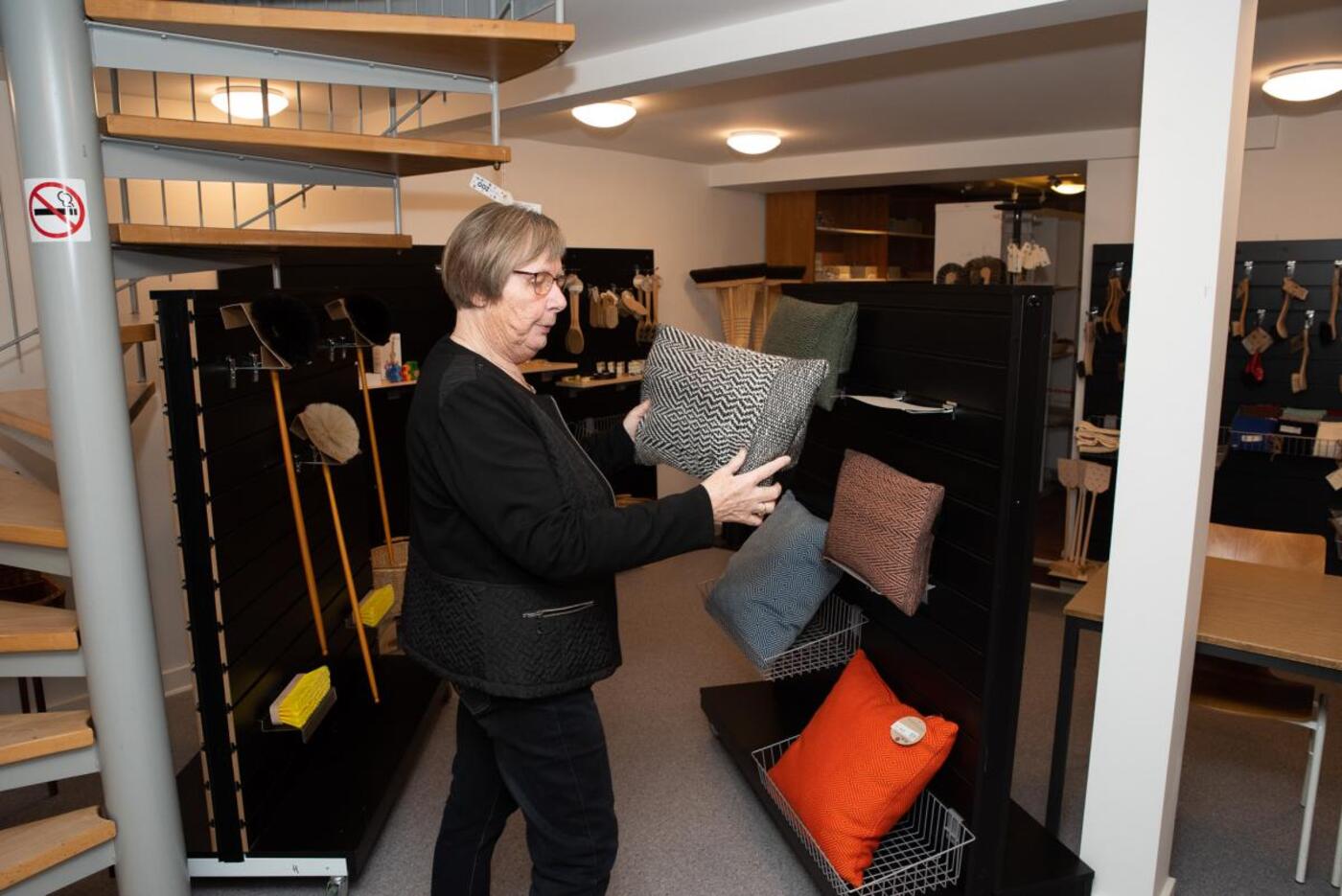 I butikken er udvalget af bæredygtige varer stort og her finder man blandt andet et kæmpe sortiment af børster til alle opgaver, vævede viskestykker og puder som har vundet priser i Paris, designet på Kolding Designskole. Alle trævarer er af certificeret træ og hårene til børsterne er af hestehår, gedehår, grævlingehår og fra gris – man anvender kun naturprodukter.