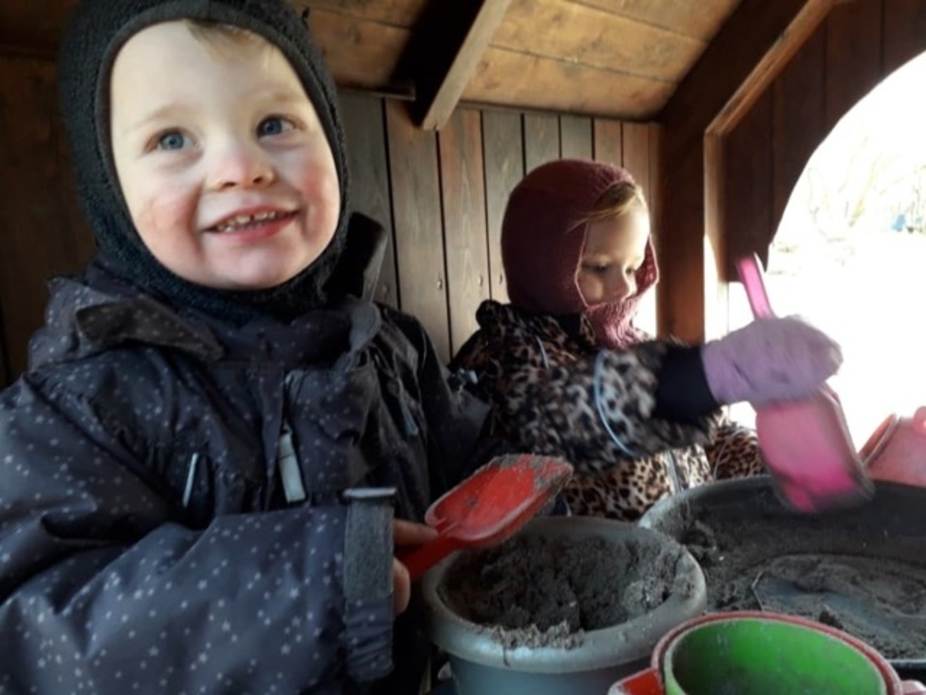 Vi er så heldige at vi har en fantastisk stor have/legeplads, hvor det er muligt at dele arealet op i små enheder, så hver grupper har sit eget rum. Det er interessant at se, hvordan børnenes fantasi bliver igangsættende for helt nye lege og initiativer, som vi ikke har set tidligere.