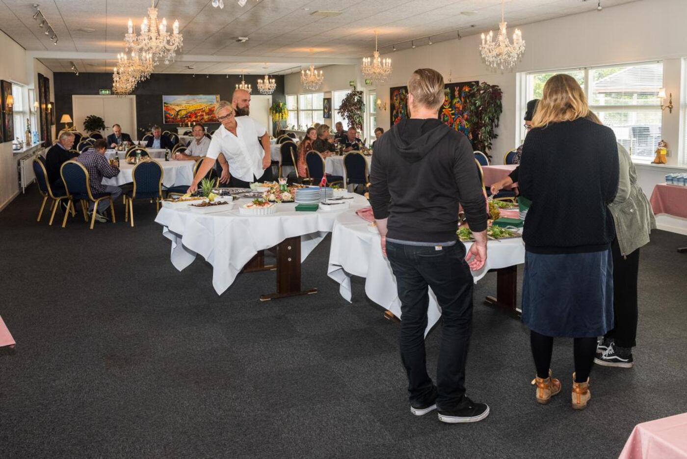 Søndag slog hun dørene op og receptionsgæsterne myldrede til med gaver, blomster og lykønskninger til Berit Iversen og personalet. Der var stillet an til en stående buffet som var ganske indbydende og alle synes at have en god eftermiddag på Restaurant Møllebæk.
