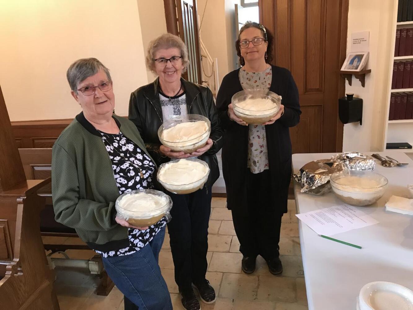 Efter høstgudstjenesten var der æblekage til alle. På billedet ses de tre skønne mennesker, der havde lavet æblekager til alle i Kirken. Fra venstre Olga Nielsen. Tove Winther og Carina Kjærgaard.