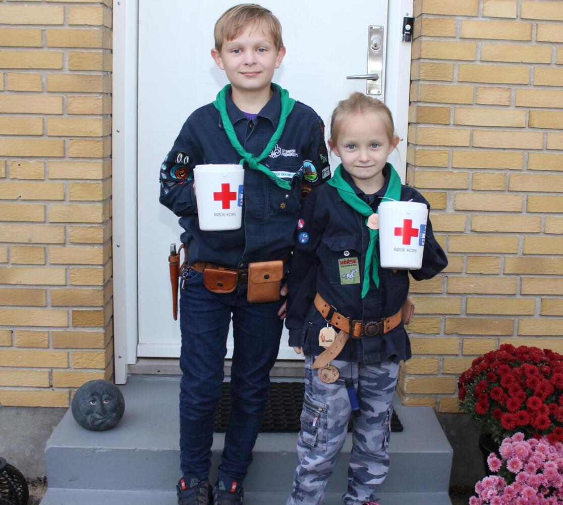 Martin (12) og Olivia (7), begge spejdere i Østbirk, er klar til Røde Kors indsamlingen på søndag.