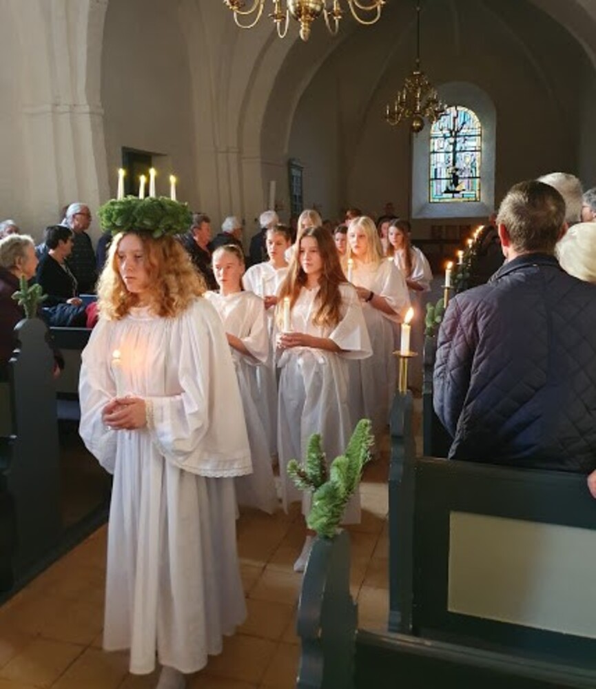 Julefesten begyndte vanen tro med gudstjeneste i Hansted kirke, hvor deltagerne udover dejlige julesalmer også kunne nyde synet og lyden af 16 nydelige konfirmander i luciaoptog. Stemningen var god ligesom sangen, og der var mange smil at spore i kirkedøren, da selskabet forrykkede til kirkehuset efter gudstjenesten – nu skulle der julehygges