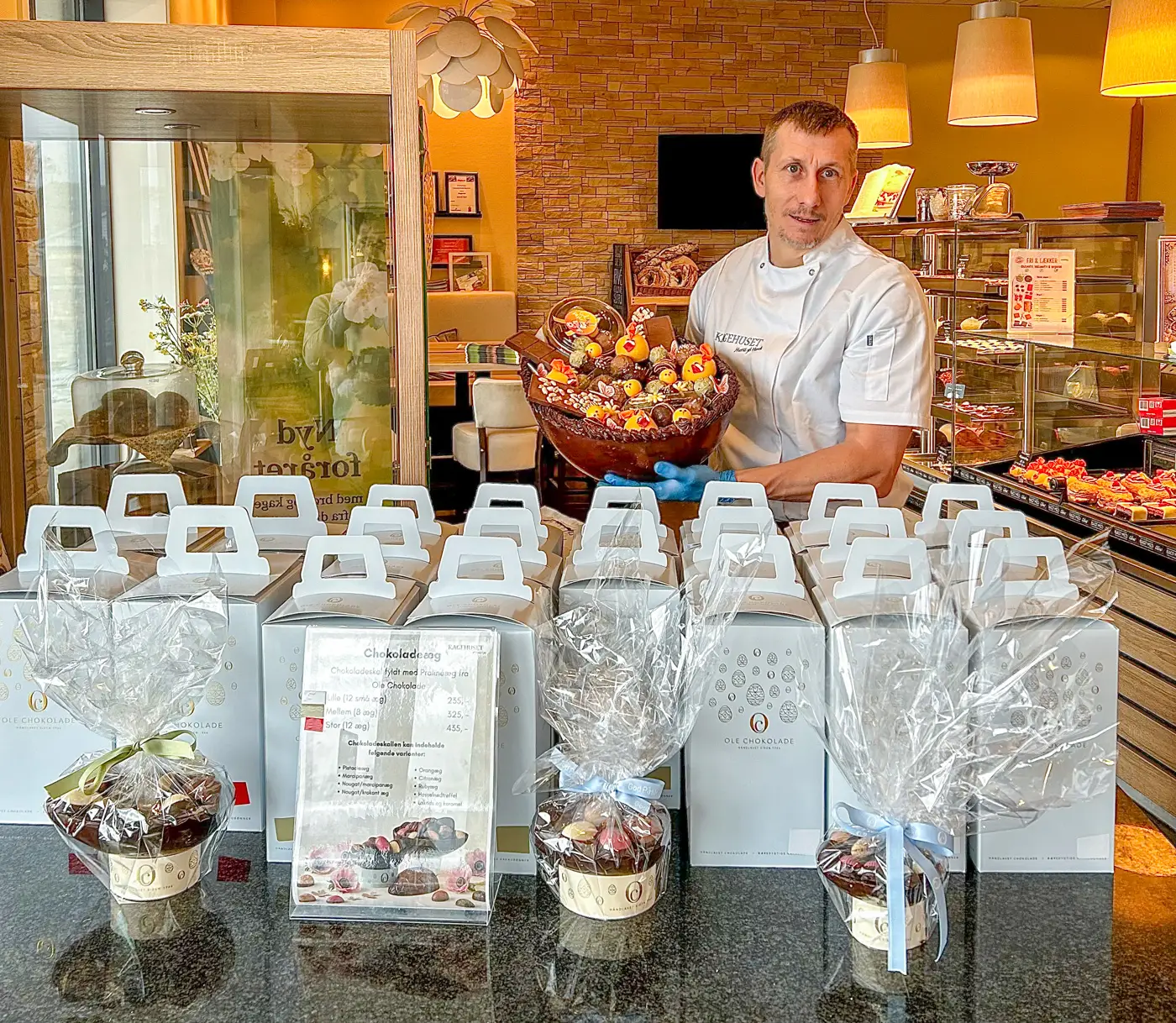 Bagermester Henrik Kjær fra Kagehuset har lavet et stort håndlavet chokoladepåskeæg til en værdi af op til 4.000 kroner. Ægget kan vindes, hvis man finder vinderkortet i en af æskerne med chokoladeæg. (Pressefoto)