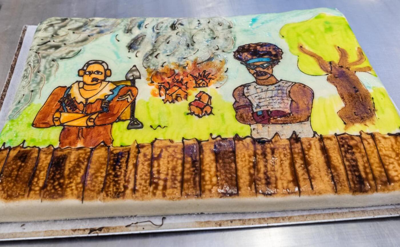 I år var temaet Fortnite – til dem som ikke kender det, så drejer det sig om et computerspil som er meget populært blandt børn og unge, samt computerentusiaster. På kagen for der lavet en stor figur af en af karaktererne i spillet; Skull Trooper.