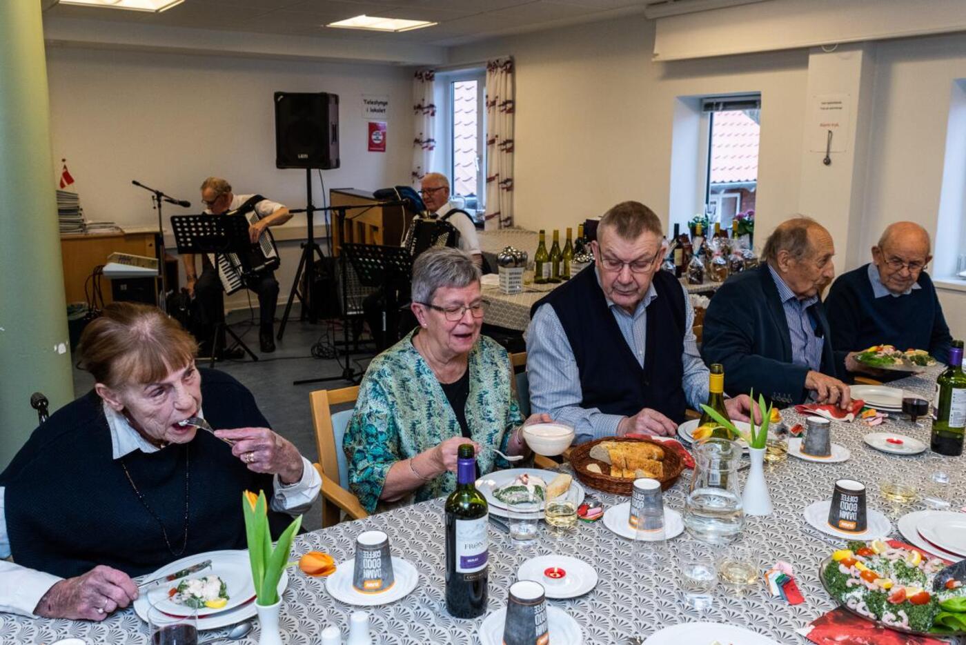 Man begyndte med lakseroulade, efterfulgt af husarsteg og desserten var abrikostrifli. Til slut blev gildet rundet af med kaffe og kage, og alle kunne se tilbage på en hyggelig eftermiddag i altid godt selskab.