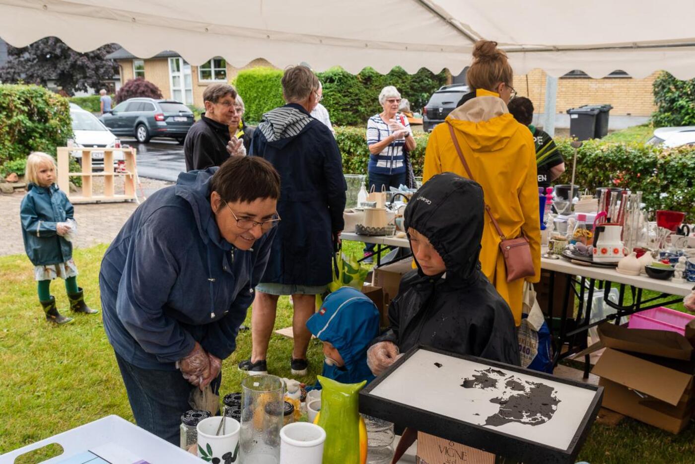 - Vi havde en mur af mennesker stående udenfor og alle ville gerne ind og se de gode loppefund. Vi tog en hurtig beslutning da vi allerede var klar og åbnede indgangen ti minutter før planlagt. Ja, selvom det begyndte at regne samtidig, strømmede både vand og købere til, fortæller en glad Tove Frandsen mens hun dirigerer trafikken ind og ud af området.