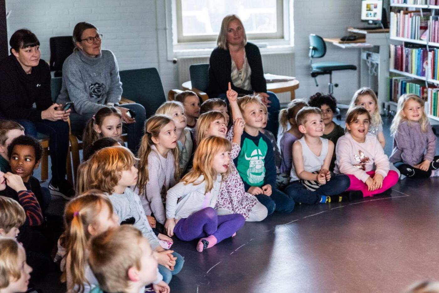 På en ganske almindelig torsdag formiddag var gulvet på Østbirk bibliotek fyldt med mere end 30 glade børnehavebørn som spændt ventede på at se teaterforestillingen I Guder med skuespiller Jesper la Cour fra Det Fortællende Teater.